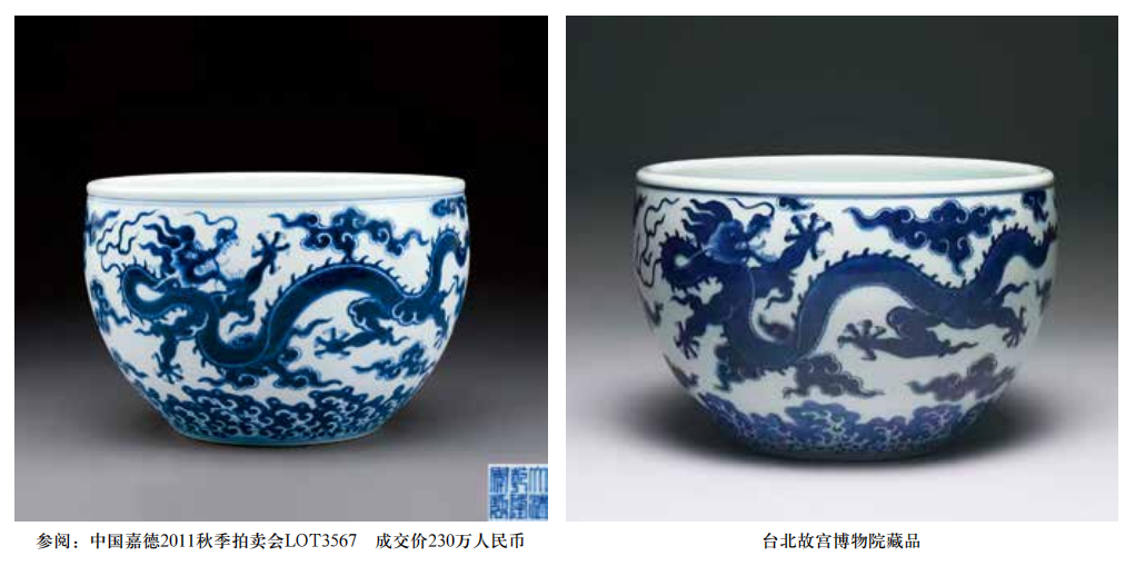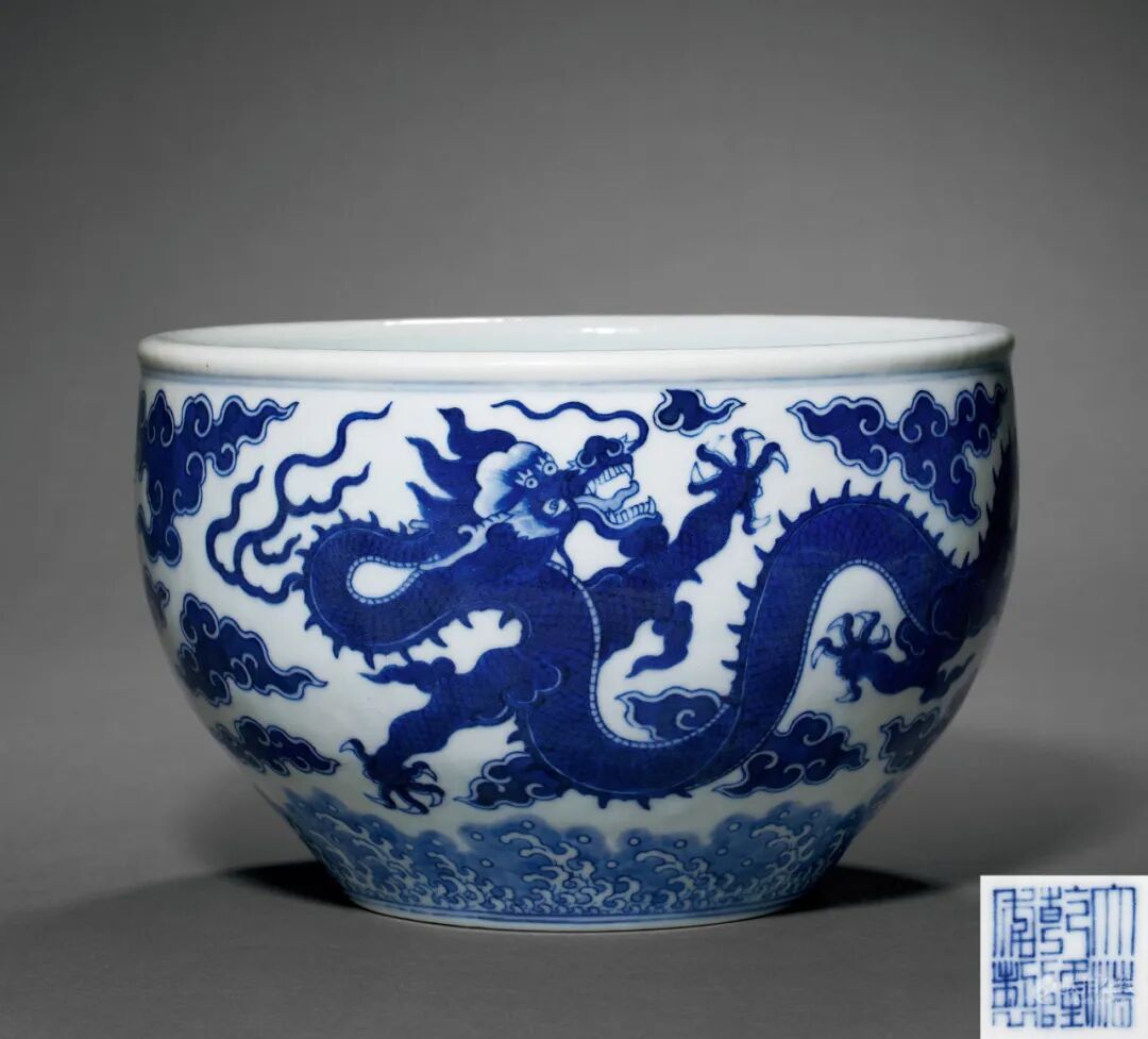 拍品估价:800,000 - 1,000,000 人民币1.《宫廷珍藏——中国清代官窑瓷器》页274,南京博物院、上海文化出版社,2003年;2.《清代瓷器赏鉴》页156,图199,上海科学技术出版社、中华书局(香港),1994年。此式缸始创于雍正时期,流行于乾嘉道三朝,同类器又见酱釉、天蓝釉、窑变釉和仿哥釉等品种。其造型来源于嘉靖官窑龙缸。晚明以将,嘉靖官窑深得世人喜爱,顺治文人叶梦珠曾如斯评价:“磁器,除柴、定、官、哥诸窑以外,惟前朝之成窑、靖窑为最美,价亦颇贵。”雍乾时期,嘉靖官窑成为清雍乾二朝的重要摹制对象,其受欢迎程度不亚于永宣二窑。造办处档案的记录亦比比皆是,如《乾隆三年内务府造办处活计档·江西》记载,“(乾隆三年)六月二十五日:七品首领萨木哈、催总白世秀来说太监高玉交……嘉窑青龙小缸一件……,交与烧造瓷器处唐英,俱照样烧造送来。烧造完时再将原磁器缴回,仍交磁器库。此磁器内有大器皿应画样带去,其小磁器皿俱各带。钦此。”由此可知,此式青花云龙纹缸为乾隆钦定仿烧,并于乾隆三年便已摹制出来。