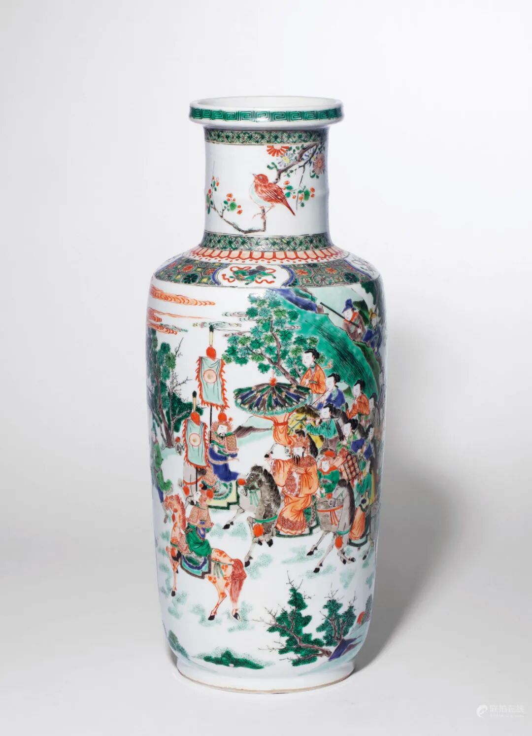 Lot 1303 清康熙 五彩人物“郊游点化”图棒槌瓶拍品估价:380,000 - 580,000 人民币本品最为精绝的故事画面通景绘于腹部,画面中心当为一骑于骏马之上着官袍者,身侧一人马下为其高举伞盖,身前二人披戴甲胄兵丁举旗,再前二小厮持齐眉棍开路。此人身后十三名女子骑于马上奏乐,热闹非凡,正是“十队红妆结束齐。驮笙载酒出郊西。佳人金缕青丝髻。骏马银鞍碧玉蹄。”与一行人相对应有二人立于桥上,一戴僧帽持拂尘,一着道袍蓄长髯,表情生动。此器所绘情节出自《昙花记》中“郊游点化”一节,讲的是定兴王木清泰一日郊游,遇一僧一道指点,顿悟迷津,看破红尘的故事。此题材故事的作品崇祯时期较多,且多为青花装饰。一般描绘场景以一僧一道及木清泰为主体,不具象体现大队人马,若本品将红妆乐队绘就者较为少见,也使得本品画面极其热闹,装饰效果极佳。