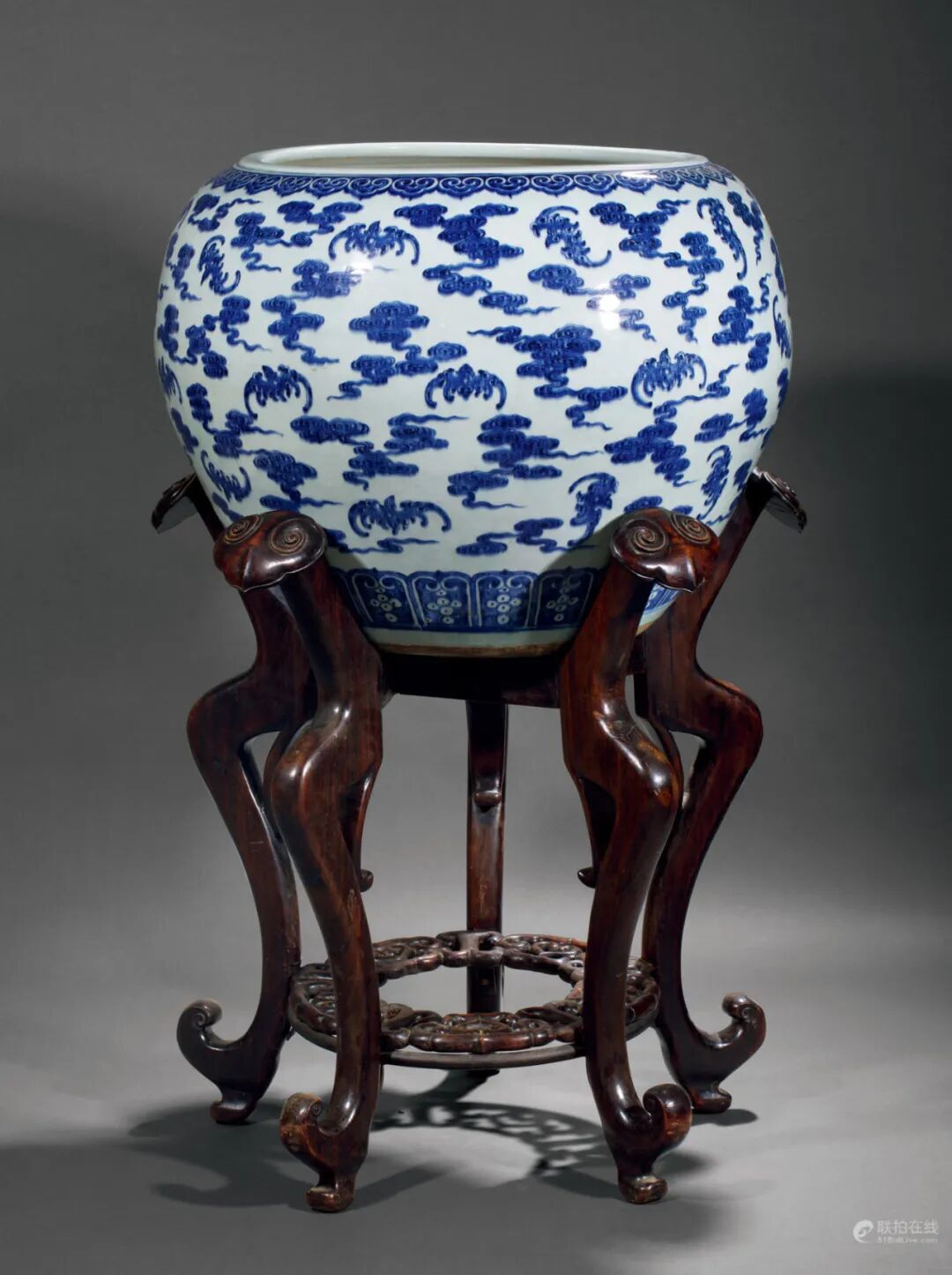 Lot 1512 清雍正 御窑青花洪福齐天钵盂式大卷缸拍品估价:500,000 - 600,000 人民币1.《女王珍藏中国及日本艺术》,皇家收藏基金会,页202,图4232.《故宫博物院藏文物珍品大系——青花釉里红》下,上海科学技术出版社、商务印书馆(香港)有限公司,2000年,页155,图1413.《故宫博物院藏文物珍品大系——青花釉里红》下,上海科学技术出版社,2000年,页208,图190此缸器型硕大,唇口,丰肩,浅圈足,胎质细腻坚质,釉面均洁莹润。通体以青花为饰,浓淡相间,层次分明,布局舒朗有秩,青花发色鲜亮浓艳,笔法写意自然,行云流水,其蝙蝠纹样口沿如意纹,底部莲花瓣纹,器身绘制云蝠纹,蝙蝠翻飞与云间,生动传神,极为灵动,形态各异,祥云迤逦,乃祥瑞之兆,寓意洪福齐天,千祥云集。青花大缸集观赏性和实用性于一体,造型古朴典雅。其体大壁厚,所以烧制极其不易。工匠将缸坯入窑,需烧制十九天以上,期间对于火候的要求十分精细,稍有不慎就前功尽弃。本件藏品从发色器型及工艺上来看,是不可多得的收藏佳品。
