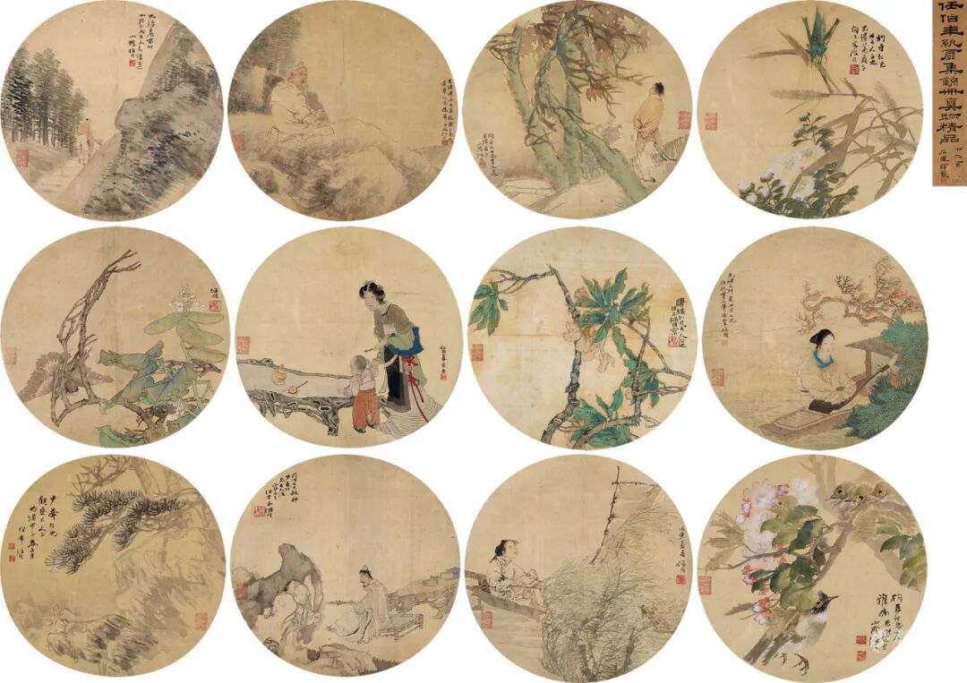 4.灼臣仁兄世大人正之,光绪乙酉夏午,海上客任颐。9.少莽仁兄观察大人正,光绪甲午春三月,伯年任颐。10.同治己巳秋杪,少足仁兄大人法家正字,伯年弟任颐。出版:2011年5月第一版印刷,《任伯年纨扇册页集锦精品册》,荣宝斋出版社1.钱镜塘(1907-1983),原名德鑫,字镜塘,晚号菊隐老人,室名数青草堂、六莹堂,浙江海宁人。吴越王钱镠之嫡裔。祖父辈均善丹青,富收藏。幼受庭训,丹青以外,经他手收藏过的历代书画、金石计有五万余件,其中,徐熙《雪竹图》、董源《山水图》、范宽《晚景图》、任伯年《群仙祝寿图》等堪称艺苑珍品。与吴湖帆并誉为“鉴定双璧”。西泠印社社员。1956年起先后向上海、浙江、广东、江苏及浙江海宁、嘉兴等省市博物馆及西泠印社捐赠历代书画、金石计3900余件。被誉为“今之项墨林、安仪周、庞莱臣”。2.张石园(1898-1959)又名入玄,字克龢,一字蔼如,又号麻石翁,江苏武进人,曾任上海中国画院画师、上海文史馆员。擅画山水,其作工整森秀,笔力劲健,书法亦深具功力,对金石学也颇有研究。这套册页是民国时期的钱镜塘旧藏,后归上海文物商店收藏,此册封面签条为张石园所书。钱镜塘收藏的任伯年《华祝三多图》在西泠印社春季拍卖会上以1.67亿元成交。收藏家钱镜塘对任伯年的画作十分倾心,曾经收藏有上百幅精品,并为此刻印一枚钱镜塘审定任伯年真迹之印。此件拍品全册十二幅,人物、花鸟、山水皆备,时间跨度约26年,反映了任伯年绘画艺术自面目初成至进入化境的全过程,是研究任氏艺术的重要实证,弥足珍贵。