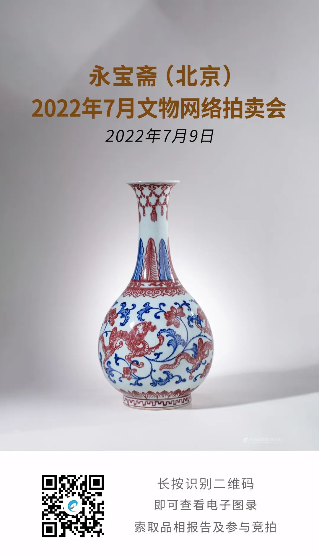 7月9日,永宝斋(北京)将推出7月文物网络拍卖会「清翫中国古董瓷器专场」,精心甄选69件明清美瓷,量少而精,青花、墨彩、粉彩、斗彩、单色釉、仿生瓷等均有涉猎,可素雅,可华丽,明清制瓷工艺的发展演变在这批瓷器中得到生动诠释。本次拍卖联拍在线将全程直播,并提供实时同步竞拍技术和服务支持。小编遴选部分精彩拍品,邀君共赏。直口,丰肩,腹部较长,下置圈足。器身施洒蓝釉,釉色深沉,釉光莹润,上腹部开光内绘鱼藻纹,鱼呈翻滚状,身体矫健有力,肥硕壮美,间以各种水草点缀其中,色彩搭配亮丽,疏密有致。所绘鱼纹为鲤鱼、鳜鱼,谐音“礼、贵”,寓意美好。下腹部开光内绘花鸟纹,纹饰绘画流畅,生意盎然。小直口,细长颈,削肩,肩以下渐硕,腹下部丰满,圈足,形如悬胆,造型典雅优美,简洁流畅,线条柔和圆润,稳定挺拔而又超凡脱俗。胎骨晶莹洁白,细腻坚密,修胎精细。通体施蓝釉,釉色均匀、典雅。造型端庄、秀气。窑变釉为清代雍正时期仿钧窑玫瑰红而繁衍出的一个新品种,由唐英所创,为清官窑一大特色。《稗史汇编》说:“瓷有同是一质,遂成异质,同是一色,遂成异色者,水土所合,非人力之巧所能加,是之谓窑变。”清乾隆时期,窑变釉烧造工艺已炉火纯青,在釉色的创制方面,除了稳定掌握“火焰红”之外,还兼具蓝绿等色谱,发色更为绚丽多姿。壁瓶造型最早出现在明代万历时期。它可挂在墙上或床内的柱子上,其器型多样,尺寸也有大小之分,所绘图案有龙纹、高士、八仙、松竹梅、斗鸡、芦雁、折枝花果、雉鸡牡丹等。对壁瓶的评价,可见万历十九年《遵生八笺》一书记载“四时插花,人作花伴,清芬满床,卧之神爽意快,冬夏两可”。到了清代,壁瓶更是文人的喜好品。其中有不少诗是对壁瓶的赞美:“蘅皋掇青藻,毡室伴清嘉”;“宿再朝烟与润,山花野卉常新”;“动洁路搴秀,静悬屋盎春”。八宝是象征佛教威力的八种宝物,寓意吉祥,寄托美好愿景。以粉彩绘制的八宝纹盖碗创烧于乾隆一朝,并列为清代官窑瓷器的典型式样,其后多有烧造。故宫博物院现存一百零九张瓷器官样中,即有此品图样。本品轻盈秀雅,典雅大气,纹饰华美,绘工精丽,所饰图纹发挥出渲染技法的特性,发色清新华丽,色彩搭配雅致和谐,予人呈现精秀华贵之气,是光绪粉彩瓷中的至臻之作,成对流传,可谓殊为难得,收藏上选。1.中国嘉德2013年5月12日,lot3210,成交价190万2.中国保利2020年12月5日,lot1759,成交价161万葫芦形,直口,束腰,双圆腹,圈足。束腰处有凸起的竹纹和弦纹装饰,腹部设双绶带形耳,又称“福寿瓶”。通体施茶叶末釉,底落「大清乾隆年制」篆书款。本品釉色纯正匀净,器形典雅大方,葫芦为长寿象征,并谐音『福禄』,秀雅中蕴美好寓意,诚为皇家青睐之物。方唇,直壁,内挖圈足,外底中心施釉。通体施白釉,釉质莹润,胎体洁白、坚质。外壁以青花绘人物山水纹,整幅画面采用高远构图之法绘制而成,远景青山迭出,云墨幻化,半山楼阁隐现,浓淡笔墨散染树丛,疏密有致,宛如仙境。中景峰峦嵯峨、间有凉亭云海,环接江面水岚,远浦归帆。同时,江面及半空留白处,又以极淡之青色晕染,犹如烟云变幻,意趣高远。江面两位老者相互道别,所绘人物寥寥数笔却可现神态,于细微处见精妙。整幅画面构图严谨,笔墨恣意,意在笔先,惟不失天真烂漫之情。敞口,曲腹,卧足。胎体洁白细腻,通体施黄釉,釉层均匀、釉光明亮,内壁以青花绘花卉纹,外壁绘莲瓣纹,纹饰勾勒仔细,一丝不苟。来源:香港私人旧藏;香港苏富1985年11月拍卖会,第494号(十二件之一)侈口,深曲腹,下置圈足,修足精致,外底以青花书「大清光绪年制」楷书款,字体流畅、自然。腹部以青花勾勒花草轮廓,再以各色彩料填涂。古铜彩是清乾隆朝装饰彩特殊品种之一,摹仿古代青铜器色彩,其制作工艺考究,是在紫金釉或厂官釉上施红、绿、黑、蓝、酱黄等低温彩,以烧制出青铜器锈迹斑驳的效果,或用金彩摹绘璀璨的错金银纹饰,其质感色彩均与青铜真品相若。这件古雅的瓷瓶,如不仔细鉴别,很难分辨是瓷是铜,可见古人仿古水平之高。此品形制源自秦汉时期的青铜钫。瓷胎,瓶体修长。外观先施一层墨彩,又用雕刻和描金相结合技法饰青铜器固有的夔龙纹、蕉叶纹、云雷纹和衔环铺首。然后又用低温二次烧成技法装饰炉钧釉彩斑,仿佛出土三代青铜器上斑斓的绿锈。外底「大清乾隆年制」六字横排篆书描金款。古意盎然,技艺精湛,为清代仿古精品。1.《清代瓷器赏鉴》,上海科学技术出版社,1994年,页173,图2272.香港佳士得,1999年4月26日,编号0510笔舔作树叶状,通体满施粉青釉色,叶边卷起,宛如一片飘浮在风中的树叶,动感极强,一只小蝉攀附其中,更添生趣。整器釉色莹润如脂,设计匠心独运,为乾隆朝仿生瓷小品佳作,亦不失为一件饶有情趣的文房逸品。玉壶春之得名最开始或为一种美酒,自唐代起,唐人名酒多带春字,元代周权曾记载玉壶春酒,风味胜葡萄,而至明清两代咏赋此种酒的诗文就更多了,如“玉壶春酒送君行,谁家楼下千花明”;“犹喜秋冬会稽去,江关前醉玉壶春”。而清高宗的《咏瓷诗·官窑胆瓶戏成口号》有言“古瓶盛酒后簪花,花酒由来本一家”可巧妙的点明玉壶春之由来,即最初作为一种装酒的容器而逐渐发展为后世所熟知的花器。1.《故宫博物院藏文物珍品大系-五彩斗彩》,故宫博物院,页208,图1902.《宫廷珍藏—中国