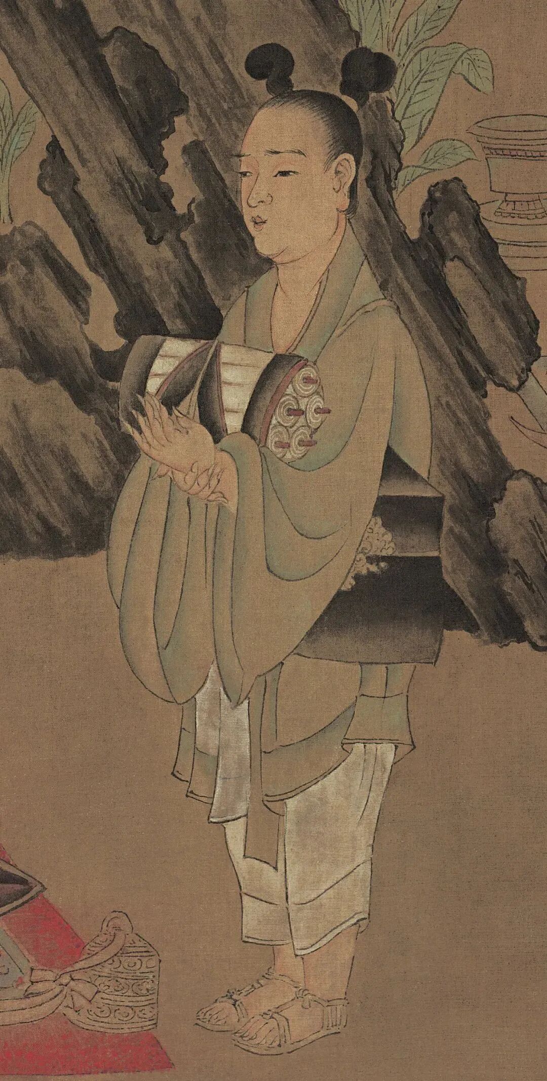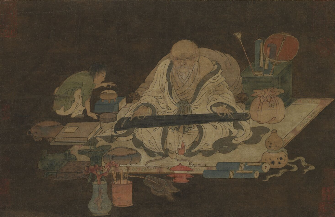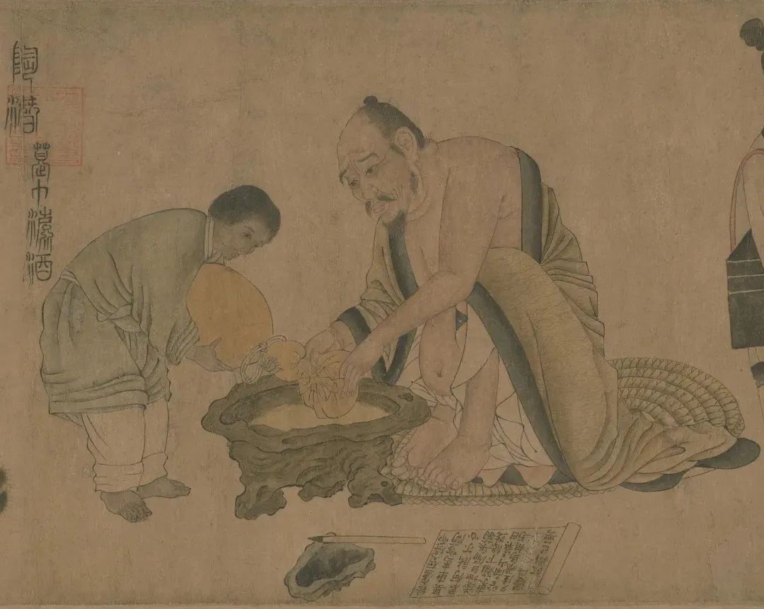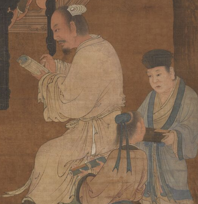 首先,什么是古籍?一般而言,古籍是指成书于1912年以前,具有中国古典装帧形式的书籍。古籍装订,便是将写就或印刷后的书籍的单页,用不同的方式连接起来,成为书或册,以供阅读。根据书籍材料、用途的不同,古籍装订的形式也不同。卷轴装,又称卷子装,早在公元前五世纪就已出现,盛行于隋唐时期。唐代韩愈《送诸葛亮觉往随州读书》诗称:“邺侯家多书,插架三万轴,一一悬牙签,新若手未触。”可见,当时卷轴装十分流行。在印刷术发明之前,古人们主要将文章写在缣帛(丝绸织物)或者纸张上。所谓的卷轴装,就是将每一页书写好的帛或纸,按顺序粘在长卷上。唐 陆曜《六逸图》中一人正在卷轴上书写,一旁放着笔砚故宫博物院藏