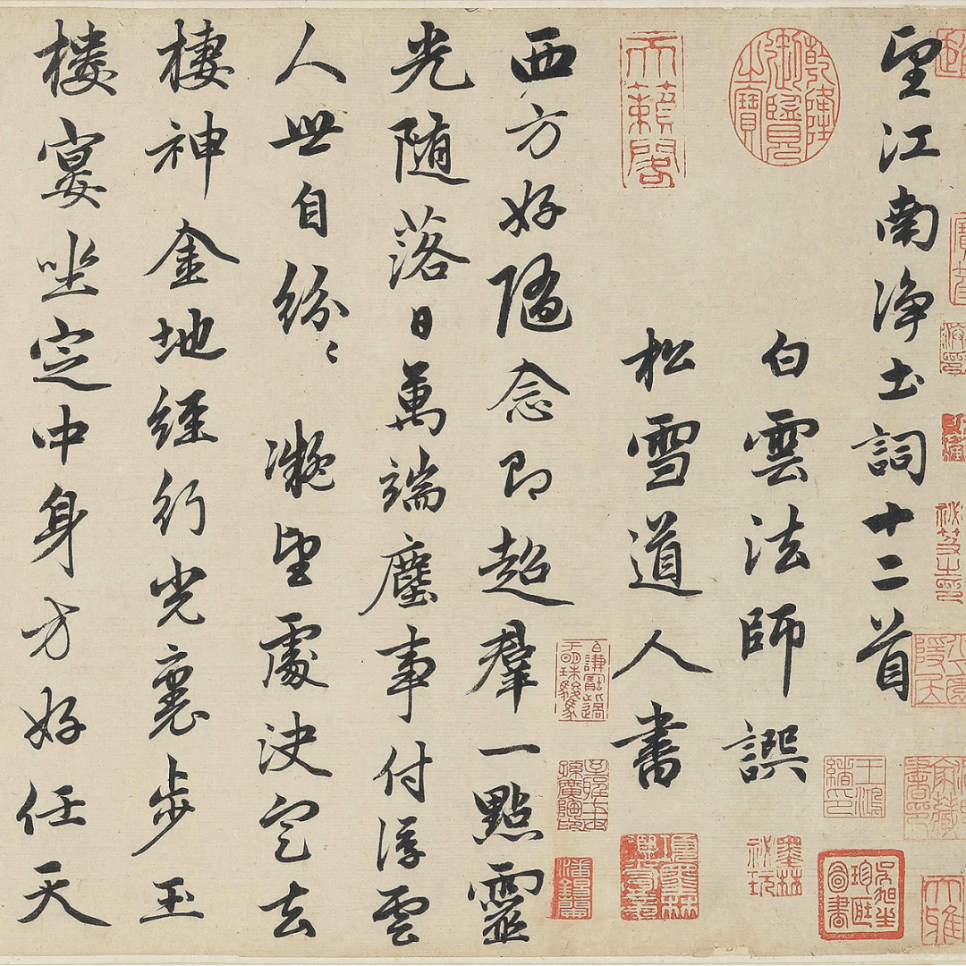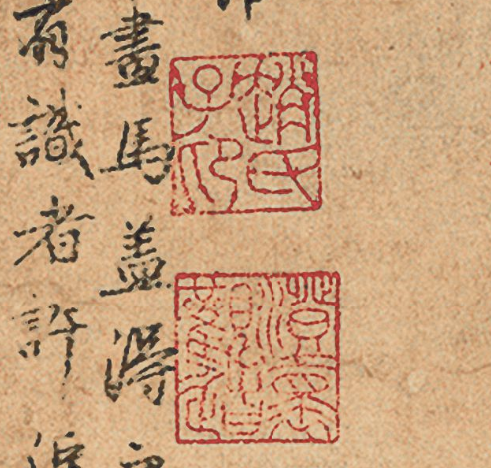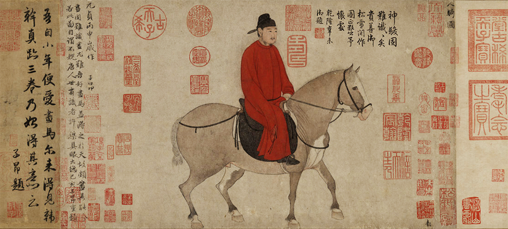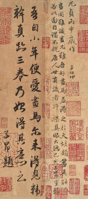 画作左上留有作者款识:“元贞丙申岁作,子昂。”“画固难,识画尤难。吾好画马,盖得之于天,故颇尽其能事。若此图,自谓不愧唐人。世有识者,许渠具眼。大德己亥子昂重题。”整幅画作的布局、人物形象与马匹画法,皆受唐画影响。赵孟頫说自己少年时便喜欢画马,43岁时画的这幅《人骑图》尽显唐代风貌。用铁线描及游丝描勾勒出的骏马人物形象,颇具唐人韩干画风。他为此也颇为得意。卷末自题云:“自少年便爱画马,尔来得见韩千真迹三卷,乃始得其意云。”咱就是说,赵孟頫这题跋颇有一种,对自己的画非常满意,能与偶像比肩的感觉~![]()
