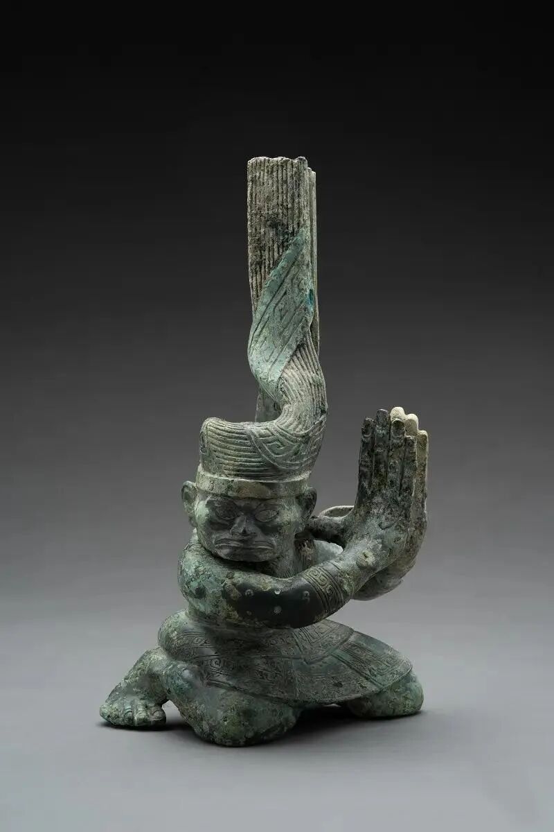 ▲4号坑出土铜扭头跪坐人像