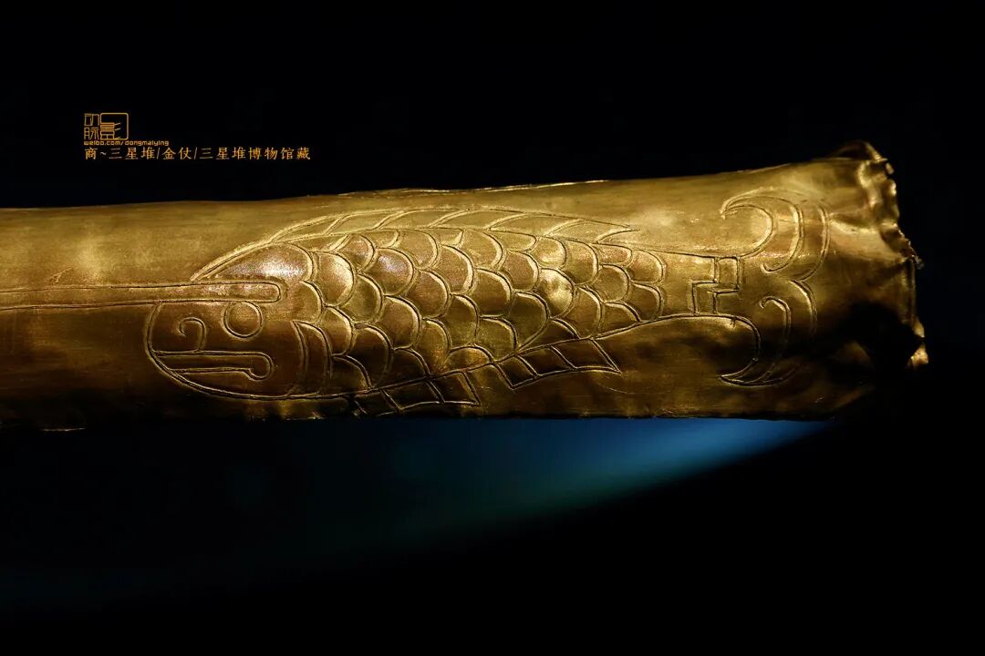 当然,三星堆国宝级文物——金杖,传递的信息更加丰富。金杖刻画的图案最下方是两个人头像,他们头上两两相对排列着四根带羽箭,每根箭的前端射入一条鱼的头部,箭杆的后面还各有钩喙的鸟一只。更有意思的是,金沙遗址也曾出土过刻有鸟和带箭鱼图案的金带。在孙华看来,这些图案的反复出现,显然不只是一般装饰,“而很可能是标志族群名称甚至国家名义的一个徽号。三星堆的金杖将两个徽号放在一起,可能想要表达的就是两个社群或族群联合的意义。”