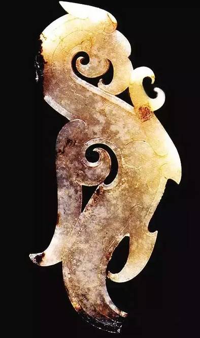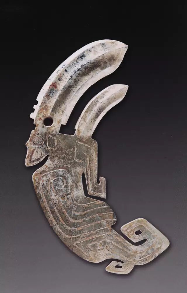 器呈白色,上有黑色沁斑,尾端稍有残缺。体扁平,两面透雕成凤鸟形状,身成“s”形。俯首,张口,尖喙较长,并向内勾卷。圆圈形目,头顶有冠,身体较长,胸前部伸出一爪,较锋利,呈抓握状。背部雕有翅羽纹,分成两叉,一长一短,均向上呈卷曲状。尾部下垂。器身阴刻云纹、曲线纹等。