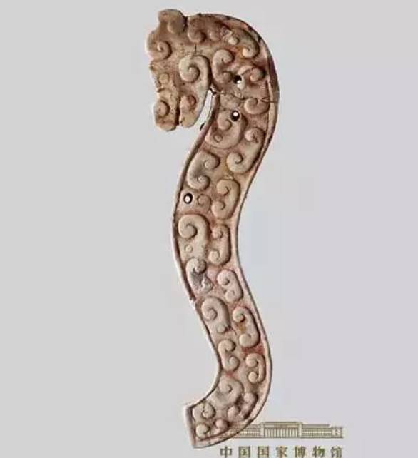 龙身中部偏上钻一个透孔,颈部钻两透孔,可以穿缀,应为组佩的饰件之一。