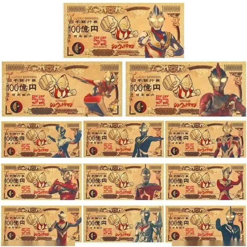 奥特曼英雄纪念钞券正面分别印刷了迪迦、戴拿、纳伊斯、阿古茹、艾克斯、雷欧、赛文、泰罗、盖亚、诺亚、高斯,背面则印刷了奥特曼的全家福。