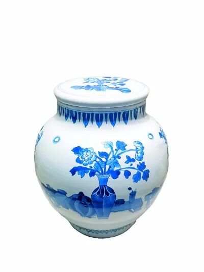 碗礁一号清代沉船出水康熙年间青花月下清供图盖罐。李韵摄