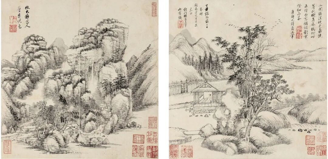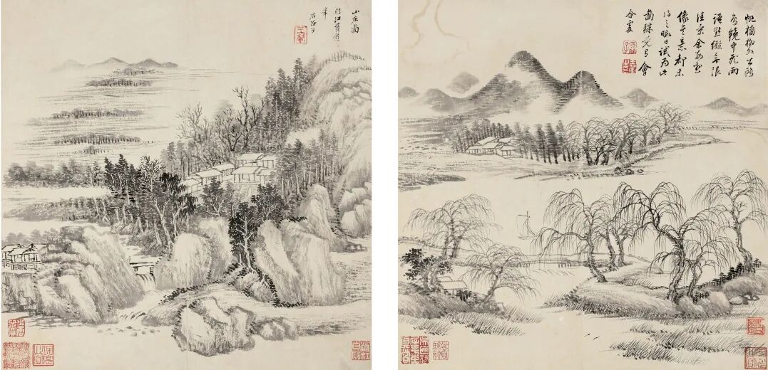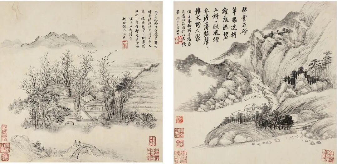 1. 王时敏之子王掞上款。按王翚年表,1696年,王翚六十五岁,在京搬进了王掞的家中,直至最后离京。这件册页分别有多个纪年,是王翚在不同时间创作之后,写题赠予王掞的。