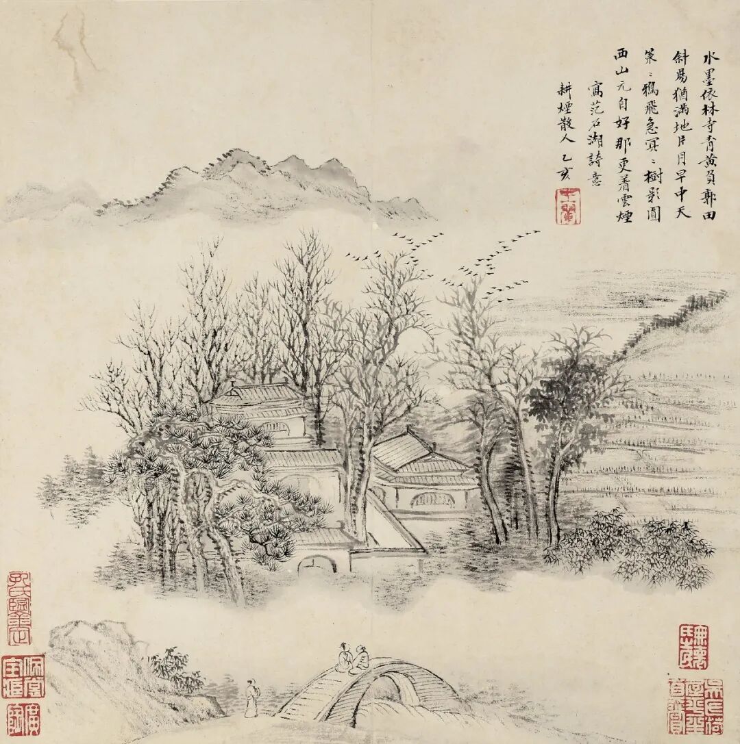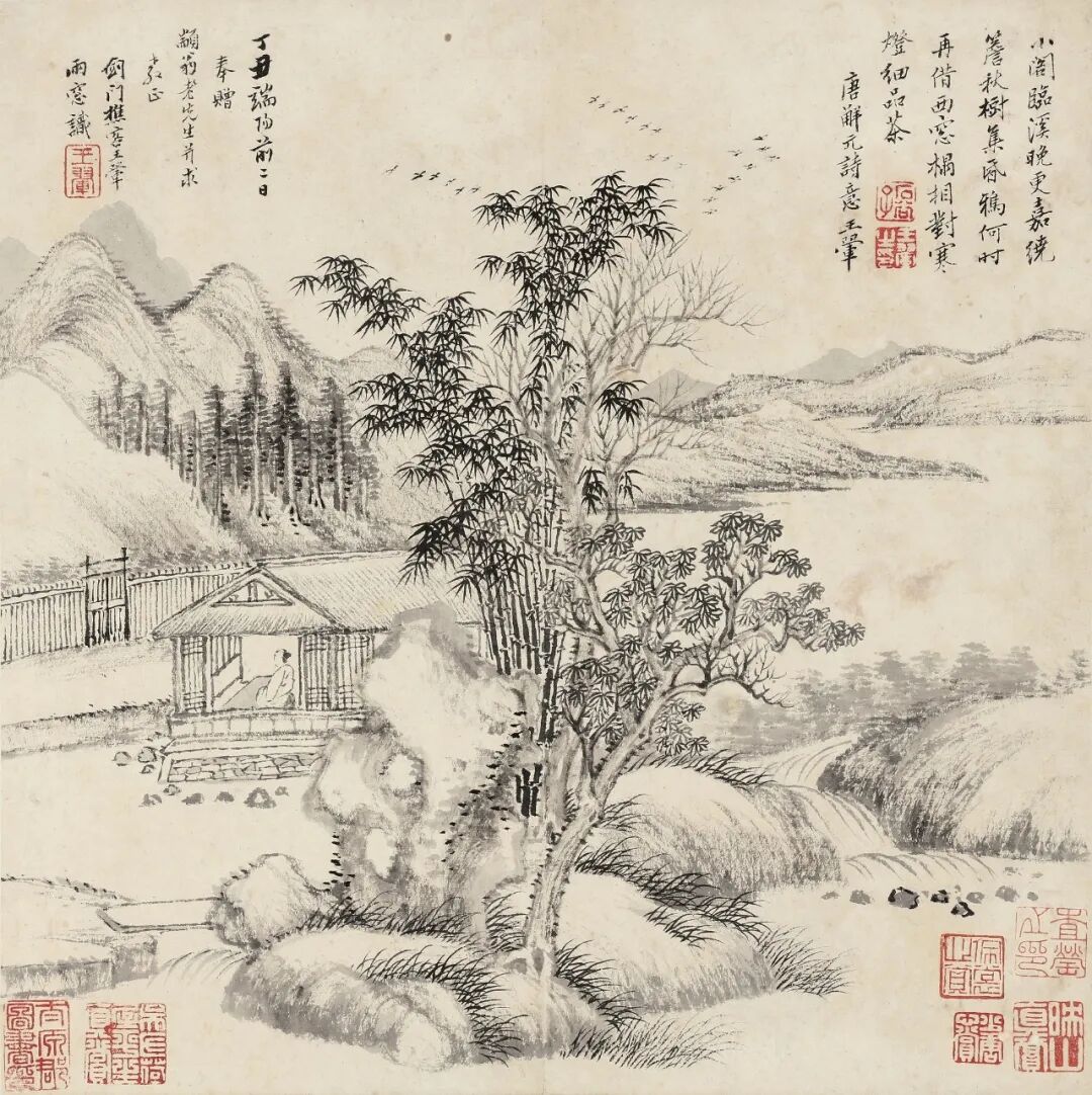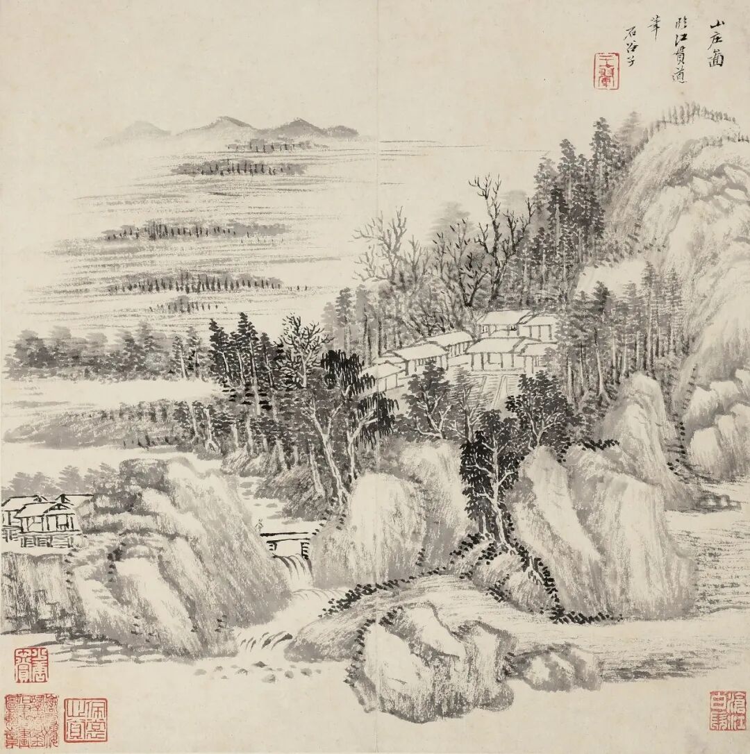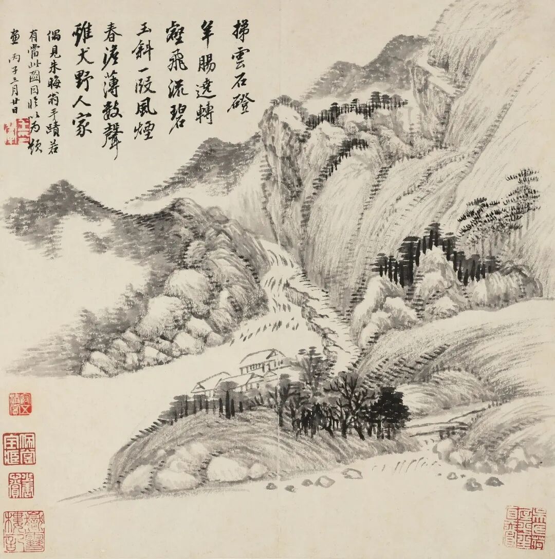 “滩上急流声若箭,城头月出势如弓。王翚仿巨然笔。”