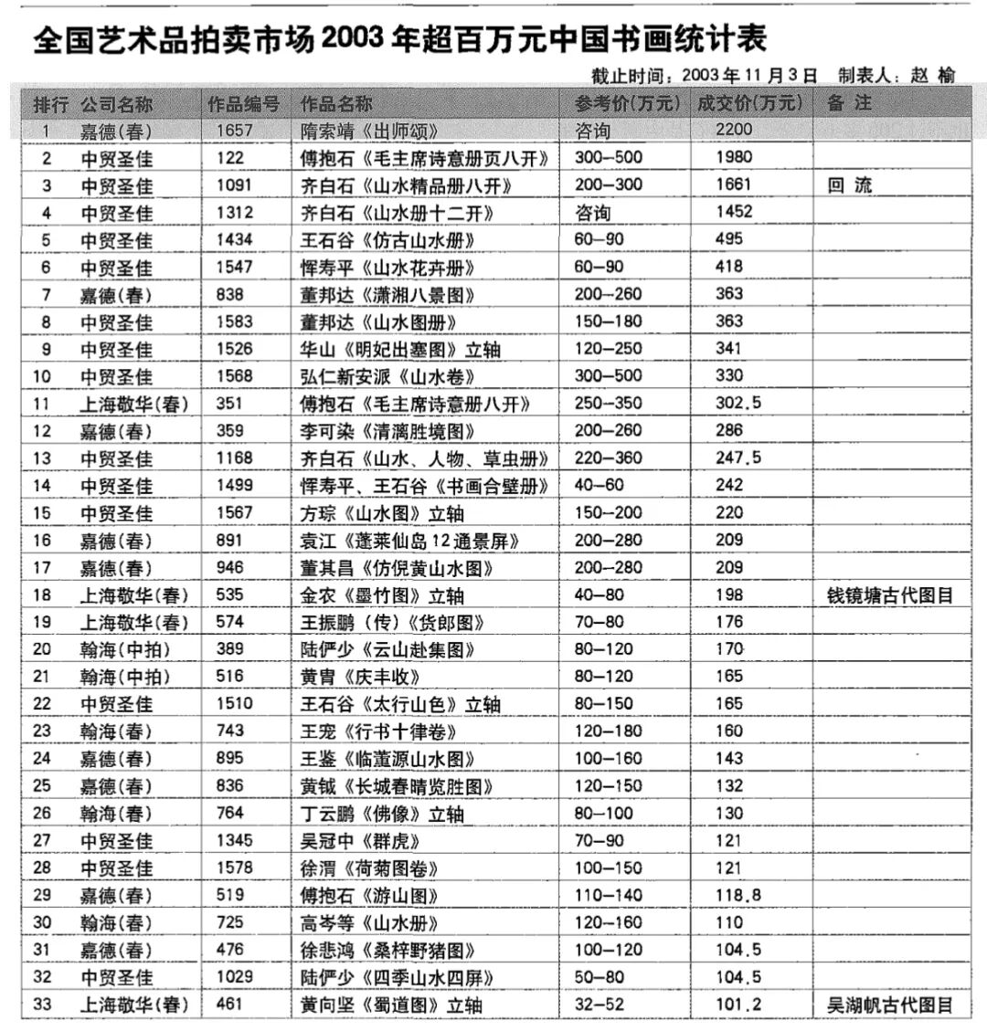 2003年中贸圣佳艺术品拍卖会,于是年的11月1日至2日在中国北京亚洲大酒店三层的亚洲会堂正式举锤。当时中央电视台经济频道摄制组,在几百平米的拍卖大厅中安装了6台直播机位,王小丫女士、米景扬先生和田涛先生则在现场演播厅向全国观众讲解了拍卖的实况。本次拍卖会有来自各省市、港台地区以及纽约、伦敦的买家,受人瞩目的傅抱石《毛主席诗意册页》、齐白石《山水精品册》均以天价成交,连破纪录。而这几本册页的成交价格在当时也一度远超《石渠宝笈》著录清代宫廷的绘画作品,也算是中国拍卖市场中,一段时代的剪影。