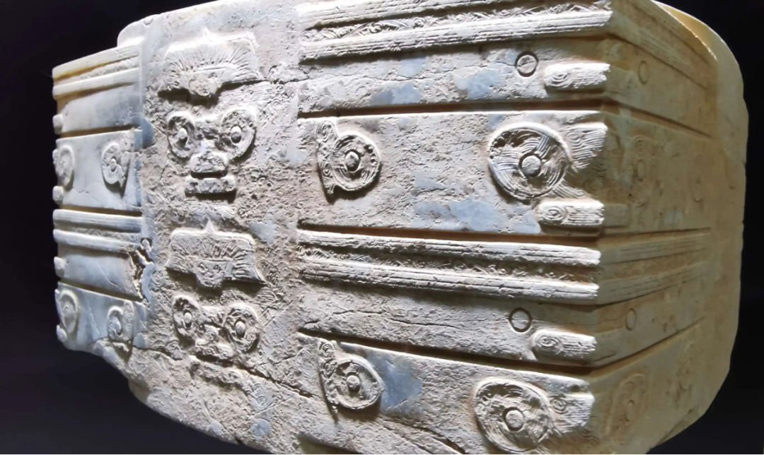 它形体远大于同一时期的其它玉琮,显得格外有气势。粗看或许只能感觉到它的古朴气息,若是细看,便能发现,它的纹饰也极为繁复。在它的琮体四面各琢刻一完整的兽面神人图像。此外,在兽面神人图案的两侧又各线刻一形体夸张的“神鸟”图案。这种人与兽的组合图是良渚文化中常见的,当时的人们敬畏天地之力,飞鸟走兽皆可以成为神灵的化身,常被奉为图腾受人敬仰,人与兽组合的纹路,恰恰体现了人们想要沟通天地礼拜神灵的愿望,印刻在祭祀或陪葬的礼器上,威严煊赫,古朴神秘。玉琮王出土时,平整地置于墓主头骨左上侧,可见它对于墓主的重要性。良渚文化已伴随时光远去,但是透过玉琮王,仿佛又能看见文明遗址上的曙光,指引着时空中穿梭的故事,交织在历史的锦帛上,引人遐想。