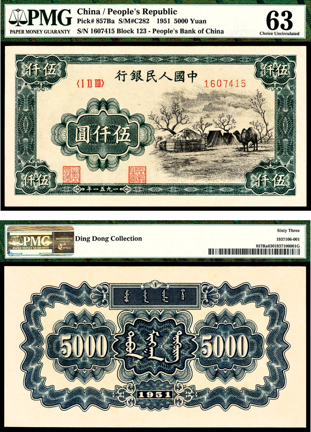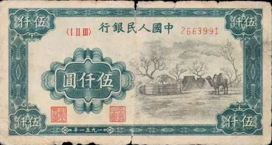 因为正面图案右侧为蒙古包和骆驼,所以称其为伍仟元蒙古包,发行于1951年,只在内蒙古地区流通。