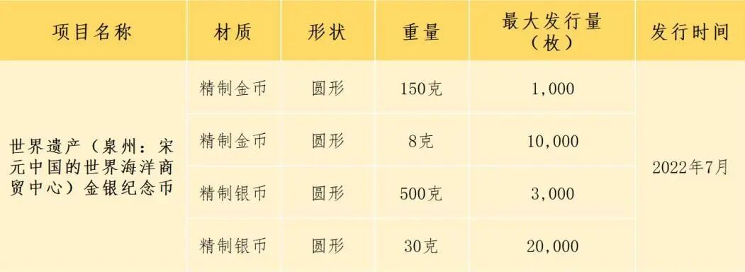 根据央行的发行计划,本月计划发行世界遗产(泉州:宋元中国的世界海洋商贸中心)金银纪念币一套4枚。