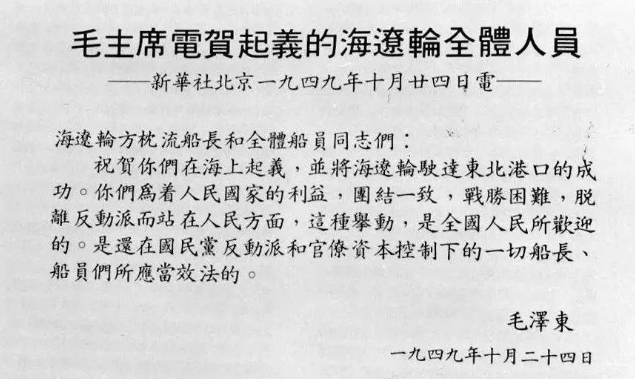 得知“海辽”轮起义的消息,毛泽东主席亲自打电报给方枕流和全体船员,祝贺他们--“为着人民国家的利益,团结一致,战胜困难”!