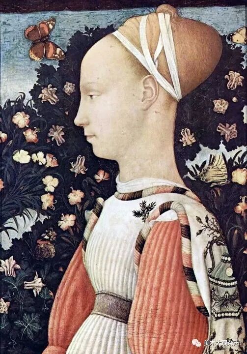 直至1470年前后,侧面胸像(profile bust portrait)一直是意大利肖像画的标准模式。为了模仿古罗马皇帝在钱币和纪念章上的肖像,15世纪的意大利君主像几乎毫无例外地使用侧面胸像的形式。比萨内罗(Pisanello)为费拉拉侯爵绘制的《雷奥内罗·德·埃斯特像》(图1)和皮耶罗·德拉·弗朗切斯卡(Piero della Francesca)为乌尔比诺公爵画的《费德里科·达·蒙特费尔特罗像》是该时期意大利君主像的代表作。而15世纪上半叶佛罗伦萨的男性肖像多以雕塑和纪念章的形式出现,也一律是胸像。这种风潮一直持续到15世纪60年代末[1]。该时期佛罗伦萨的独立肖像画以描写女性居多。为规避与观者目光相接,其一律采用侧面像的形式[2]。