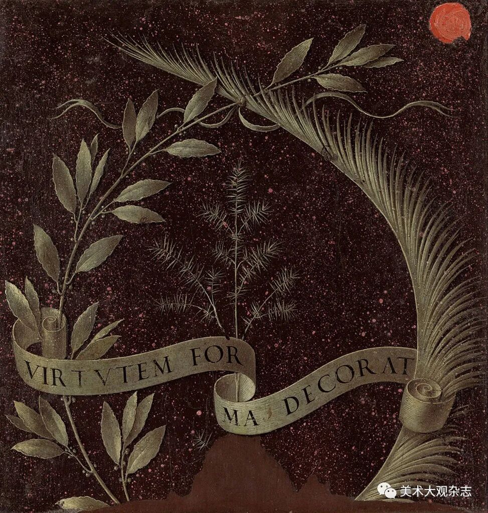 列奥纳多·达·芬奇的《吉内薇拉·德·班琪》还复兴了另一可追溯到15世纪上半叶的图像传统—徽志性肖像(emblematic portrait)。这种肖像通过徽章、寓意人物以及文本暗喻像主的美德与智慧,而这些内在美是外貌特征无法展现的。早在15世纪三四十年代,比萨内罗就已经在《吉内薇拉·德·埃斯特像》(图4)中尝试运用徽志:像主胸前别着的一枝杜松是她的名字——“吉内薇拉”的双关语,而她衣袖上绣着的双耳瓶是埃斯特家族的徽章。在《吉内薇拉·德·班琪》中,达·芬奇效法比萨内罗用杜松作为像主名字的双关语;吉内薇拉头上如光环一般的杜松树也暗喻了她的贞洁[6]。《吉内薇拉·德·班琪》是一幅双面像,在画的背面还描绘着一根月桂枝和一根棕榈枝,二者中间有一枝被拉丁文卷轴缠绕着的杜松,卷轴上写着:“美德美化外貌”(VIRTVTEM FORMA DECORAT,图3)。月桂枝暗指吉内薇拉诗人的身份,而棕榈枝则暗喻了她的纯洁[7]。在画的正面我们看见的是吉内薇拉的外在美,而画作背面的徽志则象征着她的内在美。列奥纳多·达·芬奇对徽志性肖像的探索并非孤例。大概在同一时间,皮耶罗·德拉·弗朗切斯卡在乌尔比诺创作了一幅著名的双面像——《乌尔比诺公爵夫妇像》(Federico da Montefeltro and Battista Sforza, 1474),画的背面描绘了两个取材于彼特拉克《征服》(I Trionfi)的徽志性场景,象征着画在正面的公爵夫妇的美德:在男像主背面画的是名誉与四枢德(four cardinal virtues)的寓意人物;在女像主背面画的是三大神学美德——信、望、爱的寓意人物。这些早期的双面肖像画遵循了古代肖像纪念章的规则,在背面添加徽志与铭文,以增补观者对画在正面的像主的了解[8]。达·芬奇与弗朗切斯卡在肖像画中对徽志的创意性运用,启发了拉斐尔和安德烈亚·德尔·萨托等新一代的艺术家,而他们对徽志性肖像的探索又引起了蓬托尔莫、布隆奇诺等样式主义画家的兴趣。