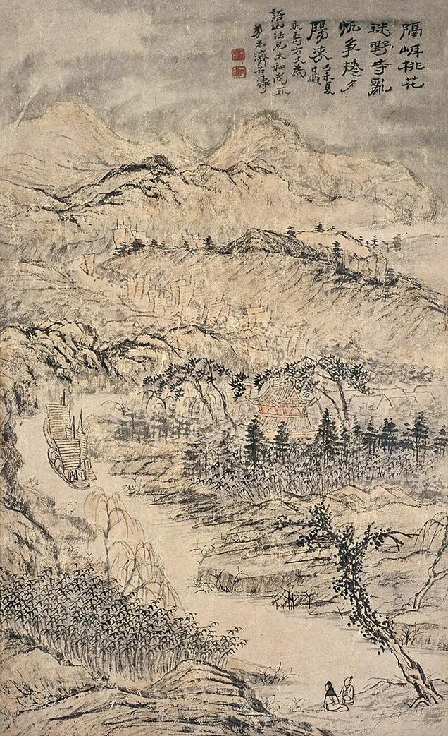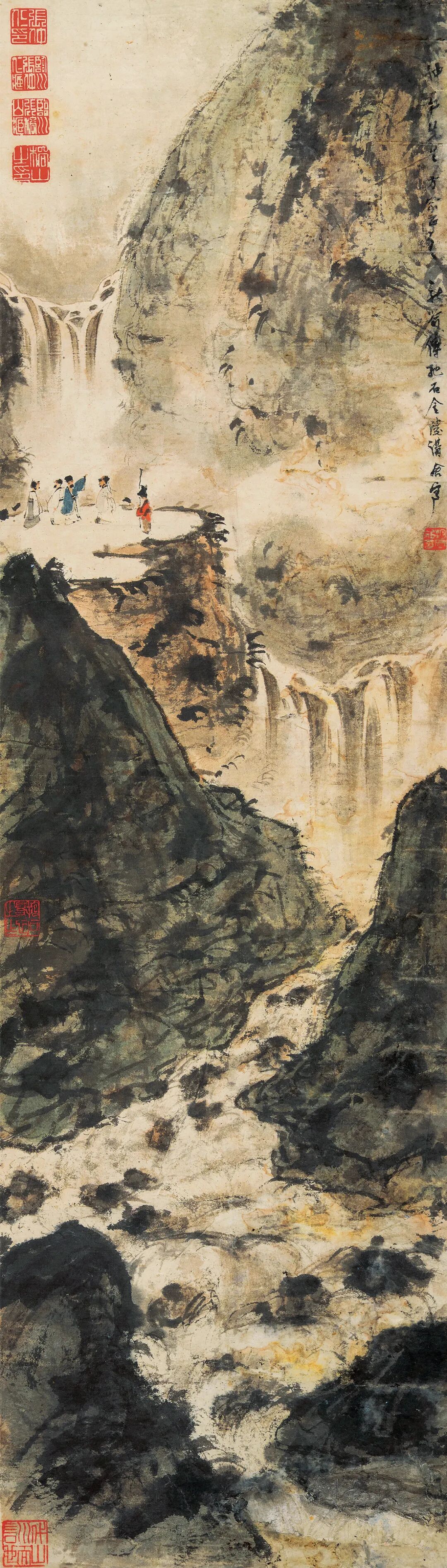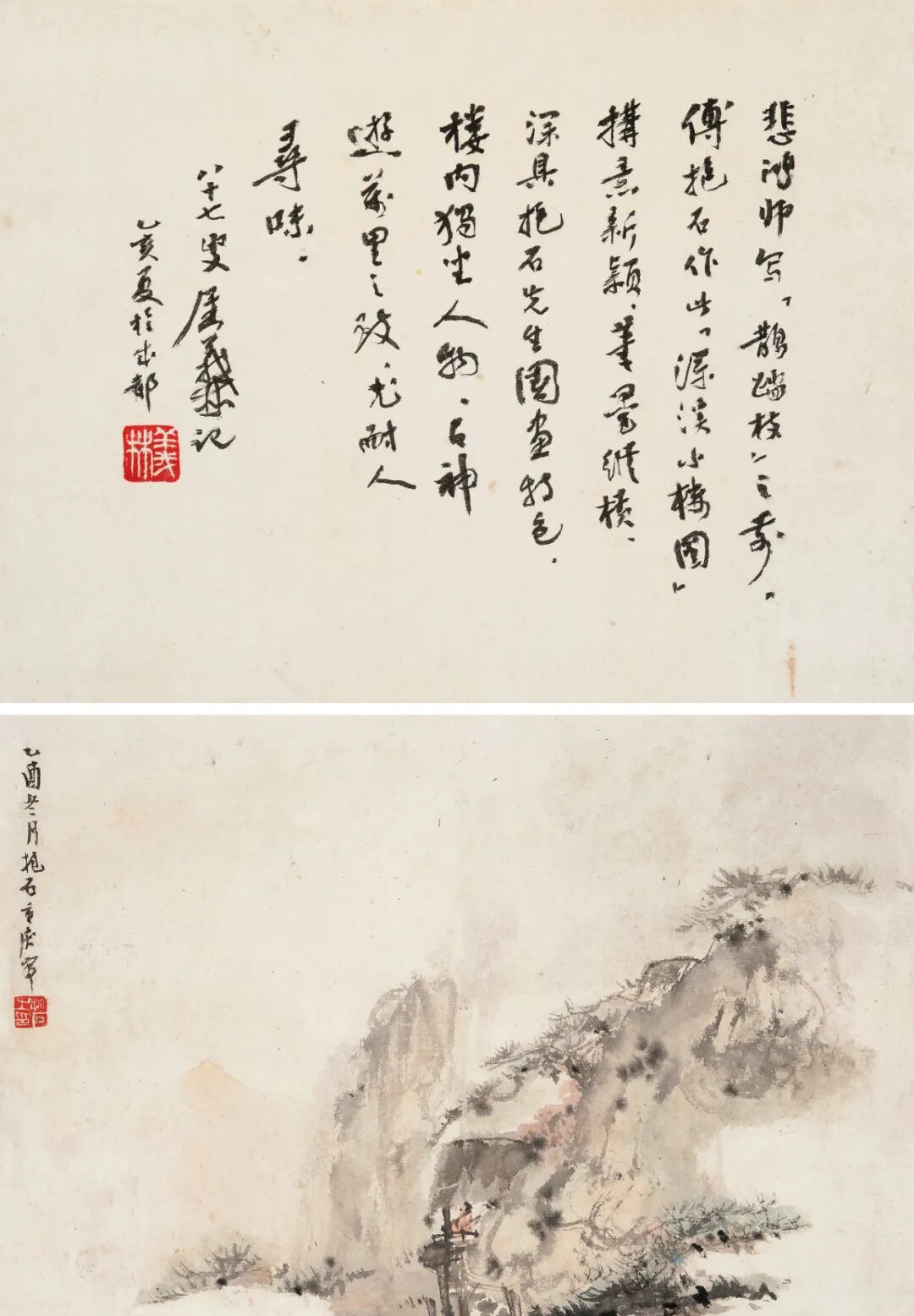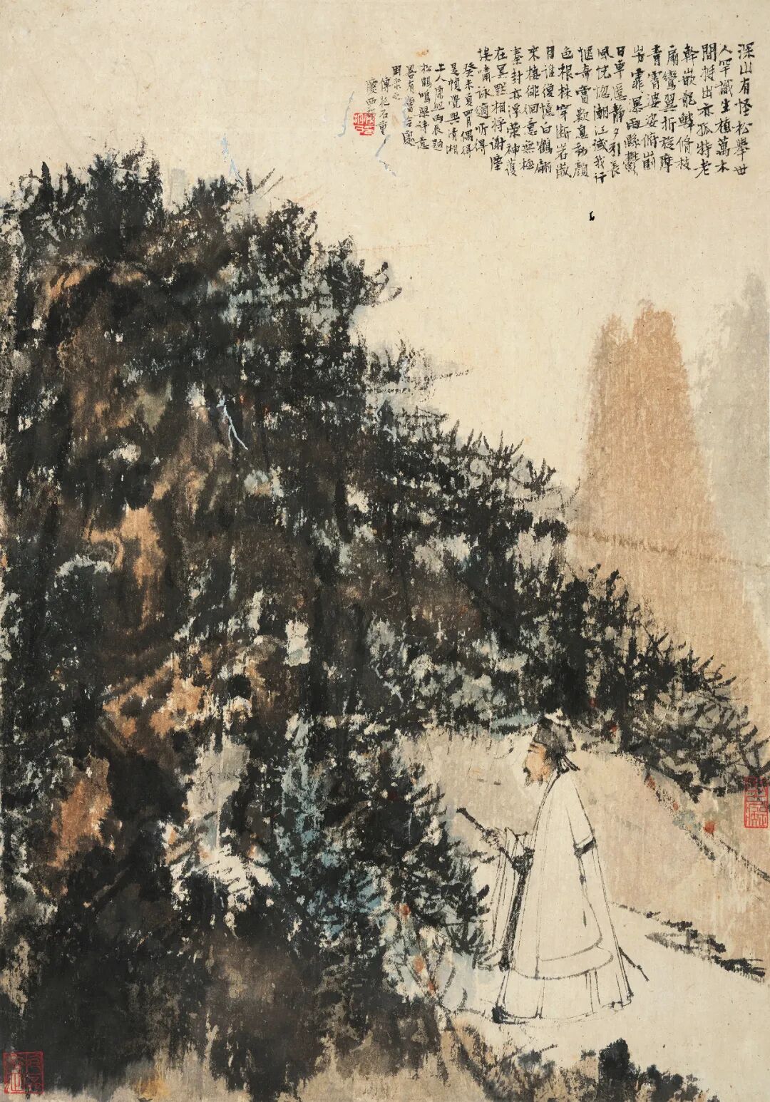 估价:RMB 1,200,000-2,200,000【题识】深山有怪松,举世人罕识。生植万木间,挺出亦孤特。老干嵌龙鳞,修枝扇鸾翼。折旋摩青霄,婆娑俯崱屴。霏霏瀑雨悬,郁郁日车匿。静夕引长风,恍惚潮江淢。我行惬奇赏,叹息动颜色。根株穿断岩,岁月谁复忆。白鹤翔来栖,徘徊意无极。秦封亦浮荣,神护在冥然。相对谢尘埃,啸咏适所得。癸未夏四月,偶得是帧,觉与清湘上人康熙丙辰题《松鹤鸣琴》诗意略有会合处,因录之。傅抱石重庆西郊。傅抱石一生最崇拜的画家便是石涛,视石涛为「震惊世界的中国民族艺术家」。他发表《石涛丛考》、编撰《石涛上人年谱》,对石涛仰慕之深正如他自己所言,「余于石涛上人妙谛,可谓癖嗜甚深,无能自已」。自1937年以来,傅抱石孜孜不倦地收集整理石涛散佚题画诗跋,精心考订,去伪存真,辑录完成700余首规模的《大涤子题画诗跋校补》,探求出石涛的艺术思想和艺术踪迹。此作创作于1943年,正是傅抱石艺术变法的分水岭。画面写苍松老树横伸而出,枝叶茂密,苍虬耸立,松干挺直,松枝斜出,盘曲瘦硬,松针细长刚劲,用墨干而浓,给人以苍劲畸形之感,短促出笔略带圆弧形,具自然生态之趣。下方岩石耸立,浑厚凝稳, 一高士悠然策杖前行,衣冠着笔精确有力,望而有高古之意,眉宇间透着睿智,须发飘动,又不乏洒落的逸气。高士眉宇间透着睿智,须发飘动,又不乏洒落的逸气,足为傅抱石盛年翘楚之作。远山以赭色渲染写出,设色亦极淡,当属傅氏纯出艺术醖酿所绘,小楷长题石涛诗,亦增益了高华厚朴之气。