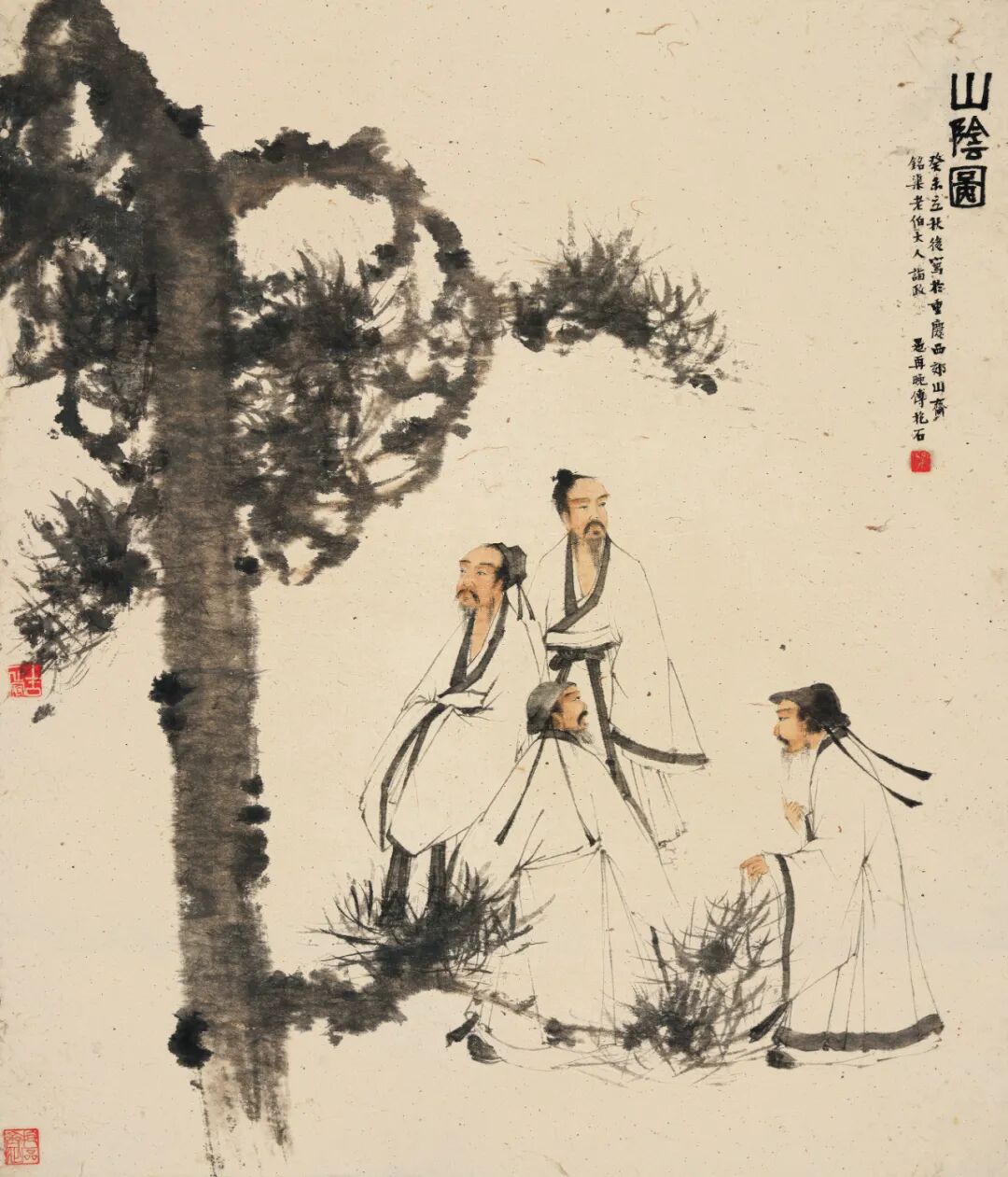 估价:RMB 14,000,000-18,000,000【题识】山阴图,癸未立秋后写于重庆西郊山斋。铭渠老伯大人诲政,愚再晚傅抱石。1.「纪念傅抱石诞辰105周年收藏大展」,保利艺术博物馆,2009年10月30日-11月10日,北京。2.「河山万里—新金陵画派精品展」,保利艺术博物馆,2010年5月,北京。3.「其命唯新—纪念傅抱石诞辰一百一十周年民间珍藏傅抱石作品展」,江苏省美术馆,2014年12月9日-14日,江苏。1.《傅抱石名作集萃—纪念傅抱石诞辰105周年》封面,内文图版11,文化艺术出版社,2009年。2.《新金陵与海上名家精品集》第9页,保利艺术博物馆,2010年。3.《傅抱石年谱》第101页,上海书画出版社,2012年。4.《其命唯新:纪念傅抱石诞辰一百一十周年 民间珍藏傅抱石作品集》第26页,凤凰出版传媒集团,2014年。5.《中国近现代书画十二大名家精品集》第241页,保利艺术博物馆,2010年。6.《首届世界华人典藏大展》第198-199页,首都博物馆编辑,北京出版社,2010年。7.《金刚坡下—傅抱石》第191页,江苏凤凰出版社,2019年。8.《嘉德二十年精品录》(近当代书画卷三) 第1085号,故宫出版社,2014年。9.《保利拍卖十五周年精品集近现代(上)》第216页,保利艺术博物馆,2020年。2.《东山图》为傅抱石画赠「铭渠老伯」之作。「铭渠」原名张家凤,字铭渠,祖籍江宁府,后迁居至贵州盘县城北门外崇山营张家坡。张家凤育有一子,取名振宗,后改名为道藩。张道藩是民国时期的著名政治人物,亦是文艺理论家,美术教育者。张道藩与傅抱石是同僚,亦相交莫逆,彼此惺惺相惜。张氏常与傅抱石切磋画艺,谈论美术史,曾撰写专文《论傅抱石之画》,并于1945年刊发于《中央日报》;傅氏亦曾为张氏刻「道藩学画」、 「思雪楼珍藏」、「百忍家风从小忍,三民主义作新风」等印章,并时常有画作奉送。徐悲鸿赠铭渠先生《七喜图》 成交价:RMB 32,200,000傅抱石用篆书题《东山图》,画面中有四位高士与一株怪松,高士们谈吐有趣,朝向前方漫步而行。42年至44年时期,傅抱石人物绘画中的衣纹使用铁线描,线条方而折,下笔遒劲简练。相比之下,人物面部的刻画较为细致。后期绘画中的衣纹有时取法顾恺之,使用春蚕吐丝描/游丝描,线条较圆。冠用墨画,中间有深有浅;面部用走势,但刻画相对细致,以此形成的墨加走势的画法,会让我们联想到唐代吴道子,也是不施装饰,仅在面部上色,有高骨之气。四位高士,一位没有冠与巾仅扎发髻,两位有丝质帽巾。他们形神各异,但均沉浸于愉悦的氛围,漫步于山阴道上。高士前方有一古松。他画古松时用水充足,任皮纸把淡墨渗透出去,形成非常自然的状态,跟人物细致遒劲的刻画形成对照,此件作品是他这个时期的一幅佳作。图上钤上古衣冠之印,说明他表现的是上古时期的高人义士。从此作中,我们可以看到他四十年代早期的一些典型人物画特征,以及他在融合山水及人物题材时展现出的超高技巧。画面中的树木画的水墨淋漓、遒劲有力,其呈现出的滋润感正似《大涤草堂图》中的梧桐。四位高士呈菱形构图,衣纹线条硬、狠、挺、劲,是典型的傅氏笔法。为了体现人物精神,傅抱石还运用散锋来点睛,凭借虚实相生来突显玲珑深邃。根据题识「铭渠老伯大人诲证,愚再晚傅抱石」可知,《东山图》为赠予张道藩先生父亲之作,「诲证」二字也体现出了傅抱石先生谦虚恭敬的态度。此作中人物的精工、潇洒飘逸,松树的水墨淋漓、酣畅豪放,就有对比的趣味,这也是我们在欣赏艺术时需要考虑的一个重要要素。