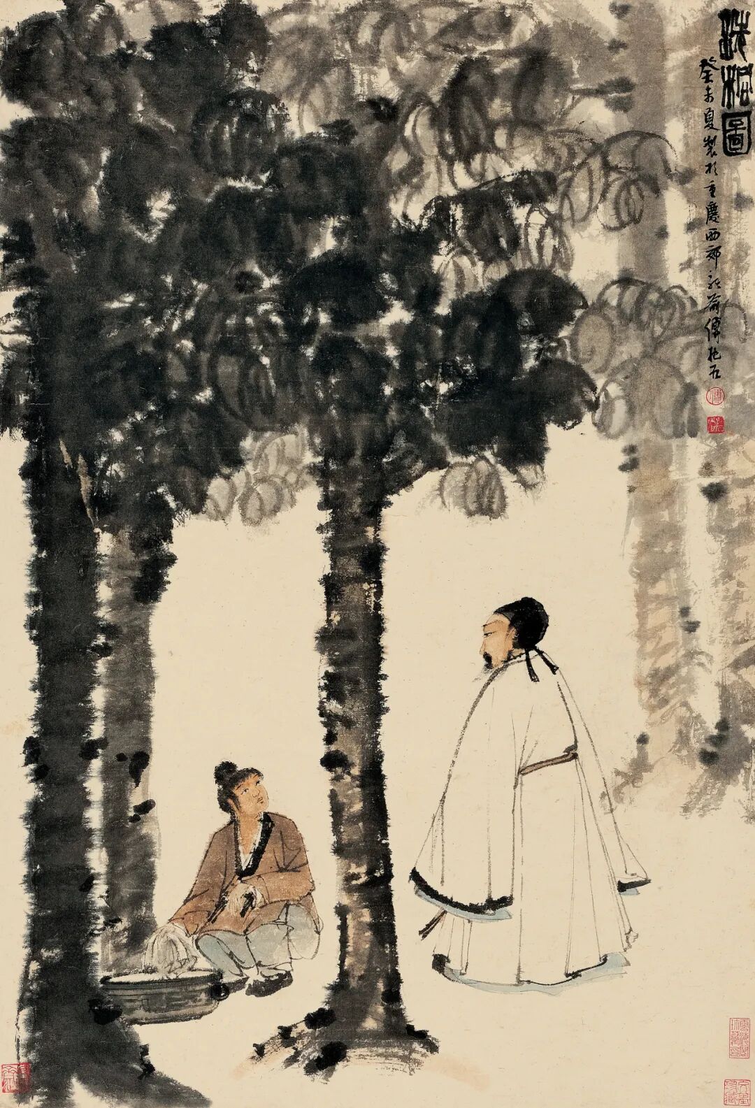 估价:RMB 8,000,000-10,000,000【题识】洗桐图。癸未夏,制于重庆西郊。新喻傅抱石。【展览】“张宗宪珍藏中国近代书画展览”,2002年6月-12月,巡回展览于上海、香港及台北。1.《名家翰墨十九期·两岸珍藏傅抱石精品特集》,第115页,香港翰墨轩,1991年8月。2.《名家翰墨中国近代名家书画全集10·傅抱石历史故实》,第61页,香港翰墨轩,1995年11月。3.《张宗宪珍藏中国近代书画—十七家作品集》,图版133,香港苏富比有限公司,2002年6月。4.《傅抱石大典》,第88页,古吴轩出版社,2004年。5.《傅抱石艺术研究》,第17页,江西美术出版社,2009年。6.《嘉德二十年精品录·近当代书画卷三》,图目975,故宫出版社,2014年。7.《金刚坡下·傅抱石》,第159页,江苏凤凰美术出版社,2019年。8.《保利拍卖十五週年精品集·近现代书画·当代水墨卷(上)》,图目215,文物出版社,2020年。1.《傅抱石年谱》,第65页,上海古籍出版社,2004年。2.《傅抱石年谱》(增订本),第98页,上海书画出版社,2012年。3.《希古与幽怀—傅抱石的人物故实画》,第301页,中华书局,2020年。1.本作曾先后经由香港、台湾资深藏家郭文基、蔡辰男、张宗宪递藏。