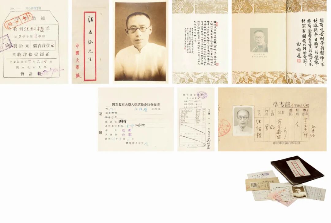 标的内收汪绍楹青年照片一张、准考证附四十三岁照片一张、国立北京大学入学试验委员会收据一张、北京大学学费收据三张、北京大学学生选课单一张(马裕藻签名)、汪绍楹中国大学授课时间表一张、北京大学校史略一册。