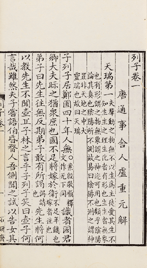 是书传本多为张湛注本,或张注合殷敬顺释文本。此本乃卢重元解单刻本,由秦恩复于《道藏》中录出。卷首有嘉庆九年(1804)秦恩复《序》,卷末有《卢注考证》。并附嘉庆十年(1805)秦氏刻本《鬼谷子》一册。