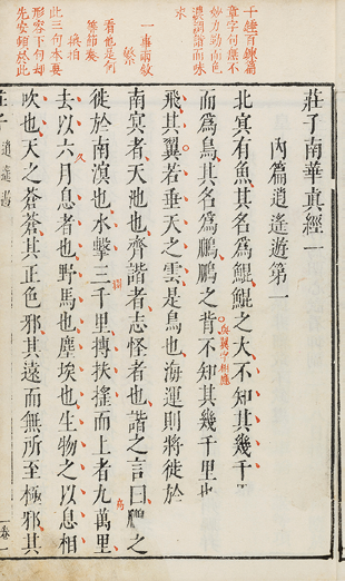 历代为是书作注者不绝,有西晋向秀、郭象、唐成玄英、陆德明等。唐天宝元年(742),玄宗诏封庄子为南华真人,尊是书为《南华真经》。此本原与《老子道德真经》《列子冲虚至德真经》合刊,刻印精良。