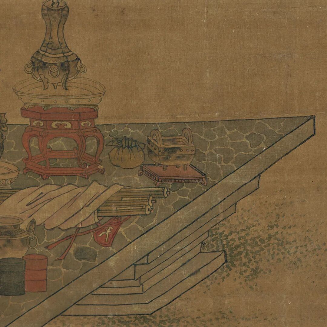 时任台北故宫博物院院长蒋复璁关于本拍品鉴定书信一通附信封这与历史上对陈遇的记载一致,蒋先生还对画面进行了描述,是本件文会图二轴无疑。此时蒋复璁当是以馆长身份出此判断,公信力自不必说。加之画中人物样式、器物(多为博古,与夹头榫画案等)、用笔方面显示出本作中创作要素的跨度早含唐风,晚至明初,是当时典型的文会图表现方式。![]()