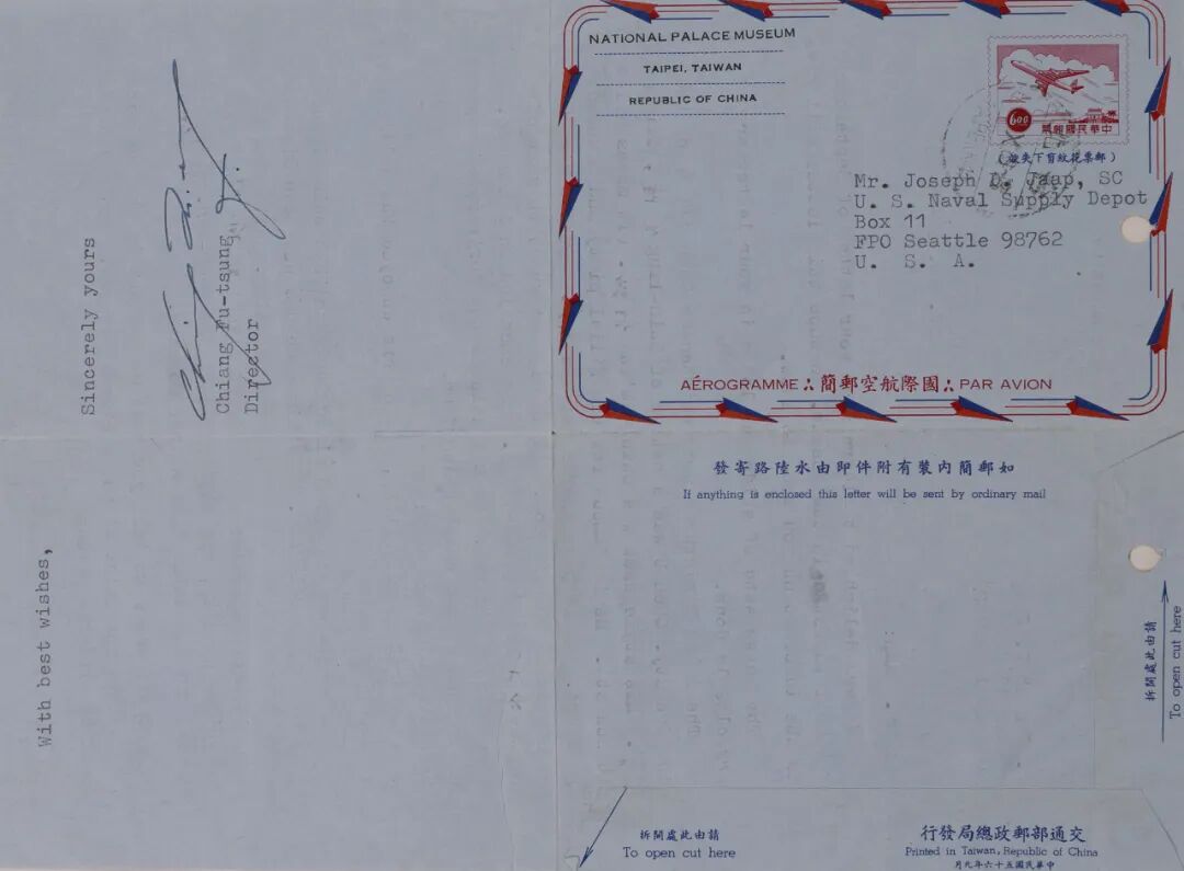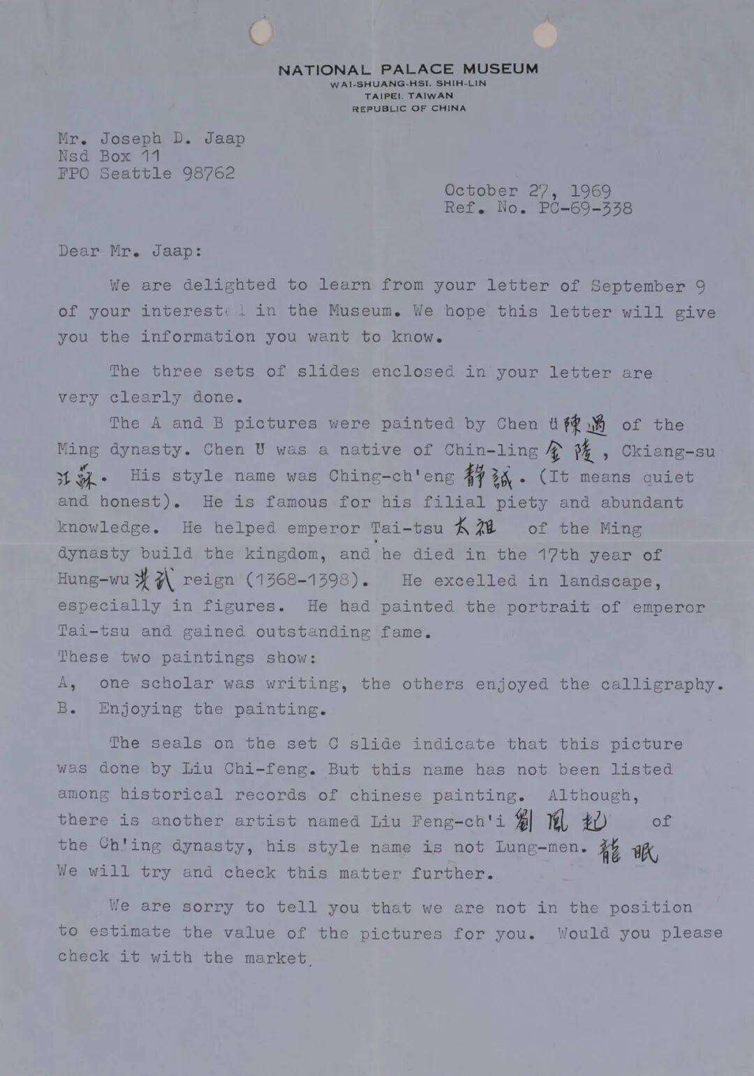 本件对幅得到时任台北故宫博物院院长蒋复璁先生的肯定与正名。1965年9月,蒋复璁出任台北故宫博物院院长。1969年时在美国西雅图海军补给站工作的Joseph Davies Jaap(1937~2021)就本件作品致信台北故宫,蒋先生在回信中首先肯定了此为明代陈遇的作品,并对陈遇的情况作了大致介绍,强调了陈遇擅长肖像画并为太祖画像。