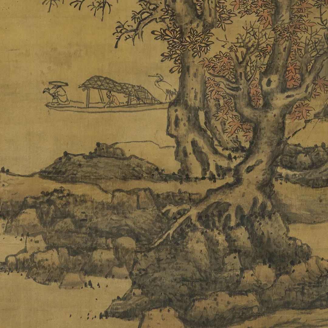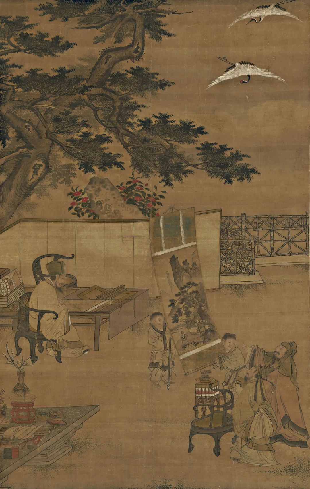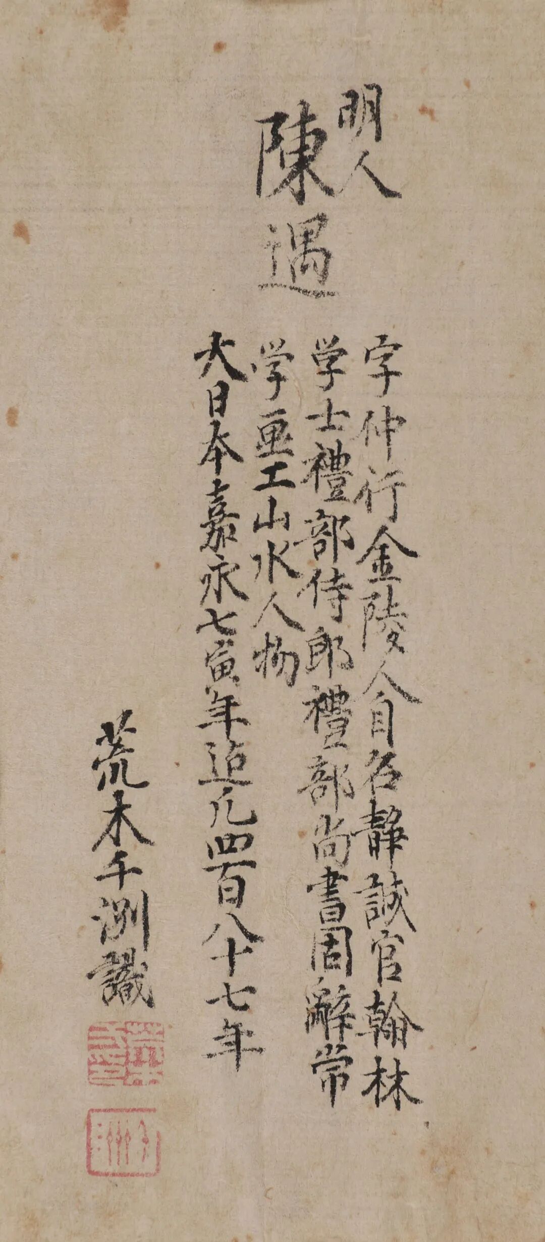 荒木千洲木盒题跋:明人陈遇,字仲行,金陵人。自名静诚,官翰林学士,礼部侍郎,礼部尚书,□辞常学画,工山水人物。大日本嘉永七寅年(1854)迠,凡四百八十七年,荒木千洲识。钤印:荒木弌印(白) 千洲(朱)本作也曾经清代日本长崎画家荒木千洲鉴赏。江户时代是存在于长崎的中日文化交流时代,江户中期是日本南画的兴起之际,中国文人画更是在日本备受推崇,而当时的学画之人多是依靠临摹中国版画、画谱来学习。因此,当时若是有一定绘画技巧的作品,定被视如拱璧。也是在这样的背景下,荒木先生在继日本南画先驱彭百川的《元明清人书画名录》之后写成了《续长崎画人传》,足见他在中国画领域的功力。依据清代日本长崎画家荒木千洲所言,此作当为明早期人物画家陈遇手笔。