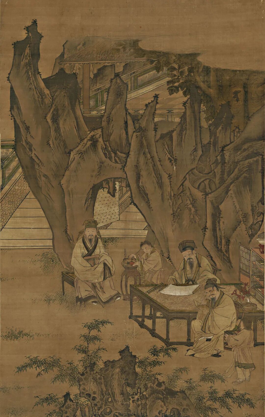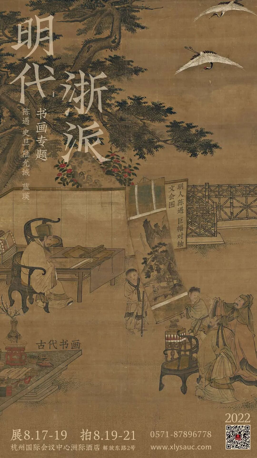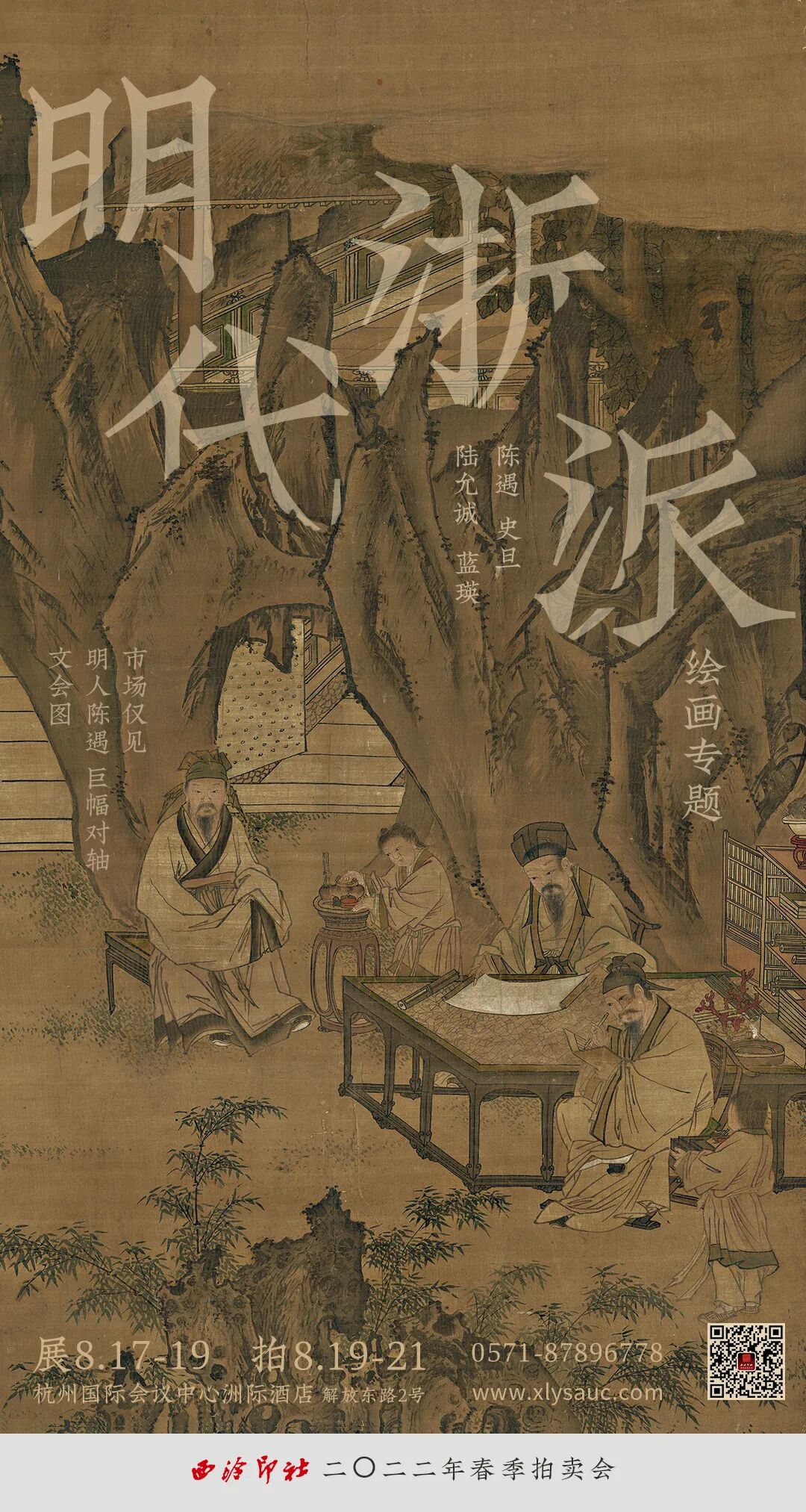 木盒题跋:明人陈遇,字仲行,金陵人。自名静诚,官翰林学士,礼部侍郎,礼部尚书,□辞常学画,工山水人物。大日本嘉永七寅年(1854)迠,凡四百八十七年,荒木千洲识。钤印:荒木弌印(白) 千洲(朱)说明:台北故宫博物院院长蒋复璁鉴赏,清代日本长崎画家荒木千洲鉴赏并题跋。附蒋复璁有关此作品说明信件一通。本拍品为明初画家陈遇所作巨幅文会图对轴,为其市场仅见之作品。此作画风有明代浙派的典型逸趣,从图中所观之画为明显马远风格山水可知,此图式为推崇马远画风之延续的派别,加之画中人物样式、器物(多为博古,与夹头榫画案等)、用笔方面显示出本作中创作要素的跨度早含唐风,晚至明初,是明初典型的文会图表现方式。据蒋复璁信中可知,他首先肯定了此为明代陈遇的作品,并对陈遇的情况作了大致介绍,强调了陈遇擅长肖像画并为太祖画像。这与历史上对陈遇的记载一致,蒋先生还对画面进行了描述,是本件文会图二轴无疑。1965年9月,蒋复璁出任台北故宫博物院院长,而1969年时在美国西雅图海军补给站工作的Joseph Davies Jaap(1937~2021)就本件作品致信台北故宫,此时蒋复璁当是以馆长身份出此判断,公信力自不必说。本件为日式装裱,保存情况良好。其木盒题跋者清代日本长崎画家荒木千洲同样认定此作当为明早期人物画家陈遇手笔。江户时代是存在于长崎的中日文化交流时代,江户中期是日本南画的兴起之际,中国文人画更是在日本备受推崇,而当时的学画之人多是依靠临摹中国版画、画谱来学习。因此,当时若是有一定绘画技巧的作品,定被视如拱璧。也是在这样的背景下,荒木先生在继日本南画先驱彭百川的《元明清人书画名录》之后写成了《续长崎画人传》,足见他在中国画领域的功力。作者简介:陈遇(1313~1384),字中行,号静诚,江苏南京人。《画史会要》、《明画录》等均记载其陈遇擅长绘画,尤工写貌,曾为朱元璋写御容,故俞剑华《明朝画院画家表》、穆益勤《明代院体浙派史料》均将其列入明代宫廷画家,“尝为高皇纪容,绝妙当时(《明画录》)”。除此之外,按《明史》有传,陈遇博经通史,是为经略奇才,他多次参与军政大事的谋划决定,为明太祖朱元璋平定天下做出很大的贡献,朱元璋渡江以秦从龙荐,特发书聘之,将陈遇比其为伊尹、吕尚、诸葛亮,引为亲信,与参机密,为其重要谋臣。陈遇先后辞朱元璋所封供奉司丞、翰林学士、中书左丞、礼部侍郎兼弘文馆大学士、太常少卿、礼部尚书等职,其“宠礼之隆,勋戚大臣无与比者”’,故人称“辞官先生”,传为明初奇人。跋者简介:荒木千洲(1807~1876),名一,字世万,号千洲,日本长崎人。江户明治后期画家、美术史家。从小喜欢绘画,年轻时跟随渡边鹤洲(1778~1830)学习,尤擅肖像画。代表作品有《续长崎画人传》、《高岛秋帆徳丸原演习图》。![]()
