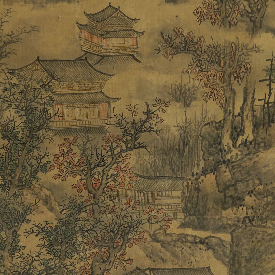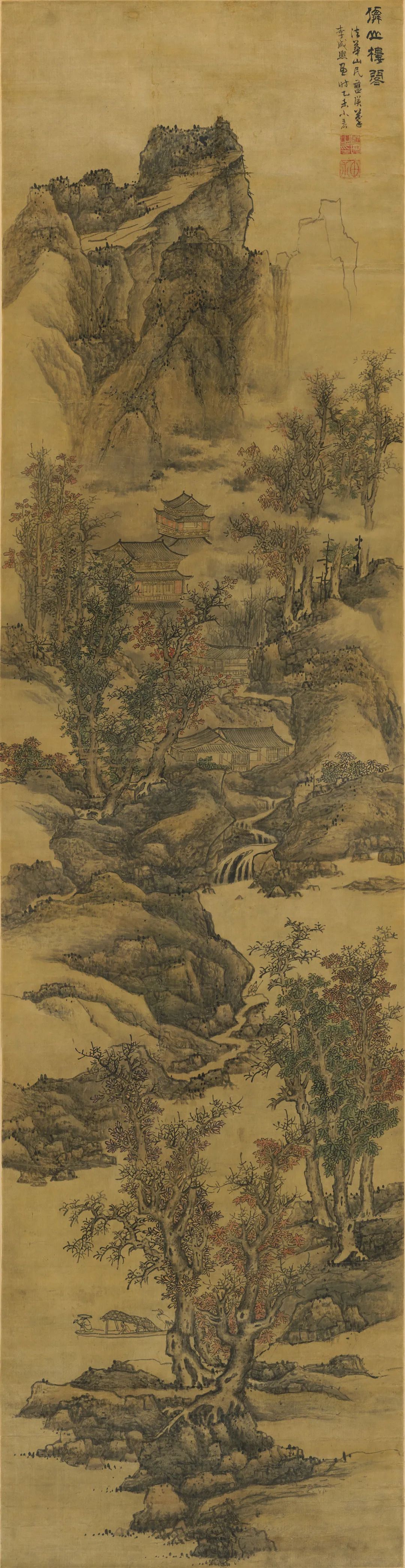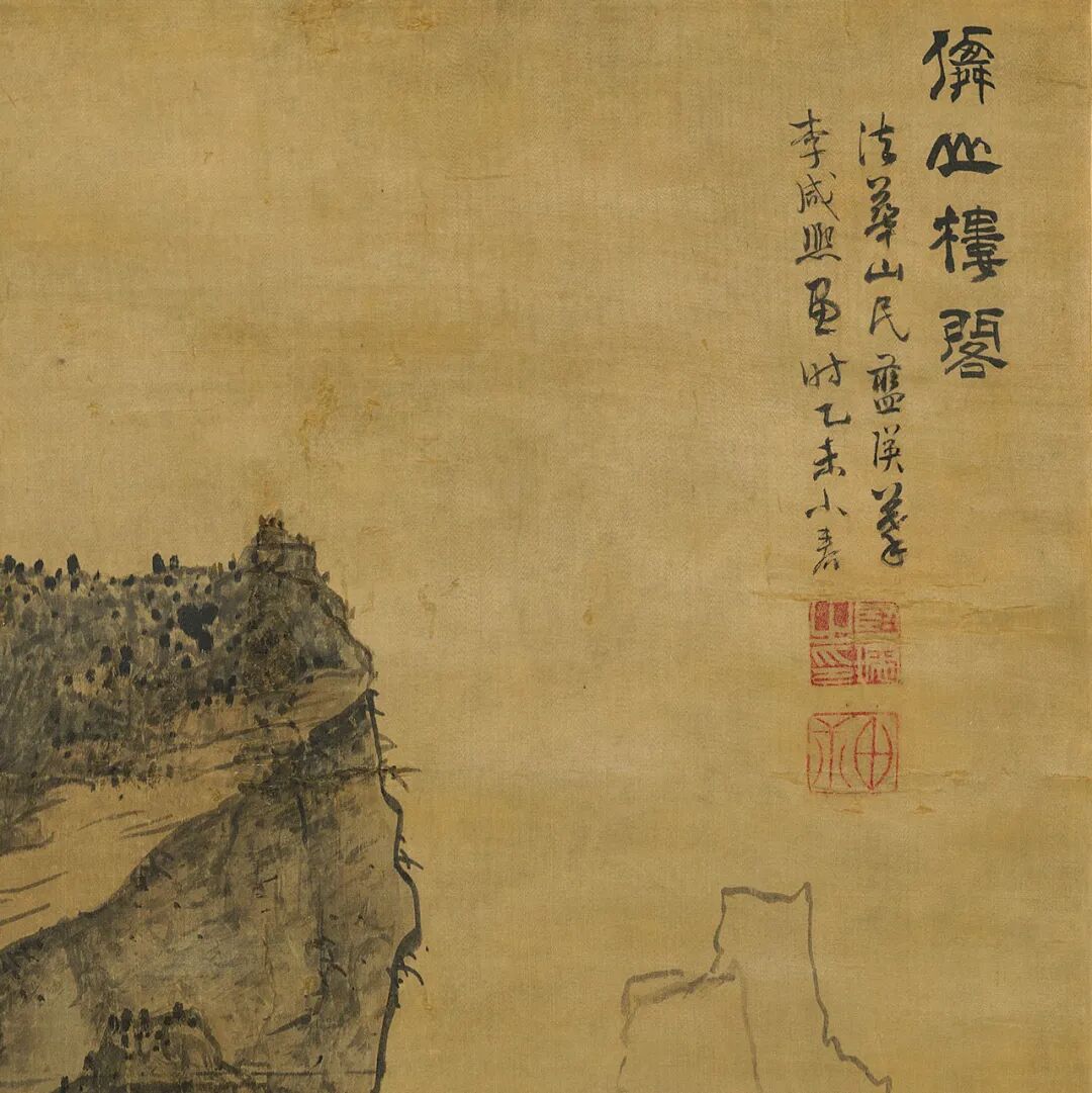 款识:僲山楼阁。法华山民蓝瑛摹李咸熙画,时乙未小春。钤印:蓝瑛之印(白)田叔(朱)(参见《中国书画家印鉴款识蓝瑛》第38、41印,1554页)说明:此作为蓝瑛晚年定居杭州之后所作,时年七十一岁。作品尺幅巨大,气势逼人,是难得一见的精品佳作。此轴为设色绫本,笔墨峭拔,敷色淡雅,体现了蓝瑛深厚的仿古能力、丰富的绘画经验和扎实的笔墨功底,同时也保留了画家独特的笔意情趣。蓝瑛晚年在明末清初的江南画坛独树一帜,成功转型并自立门户,其追随者众多,最终形成声名远播的“武林画派”。作者简介:蓝瑛(1585~1664后),字田叔,号蜨叟,晚号石头陀、西湖外史、东郭老农等,浙江杭州人。工书善画,长于山水,兼工人物、仕女、花鸟、梅兰竹石,为“武林画派”之开创者。 从“浙派殿军”到“武林宗师”