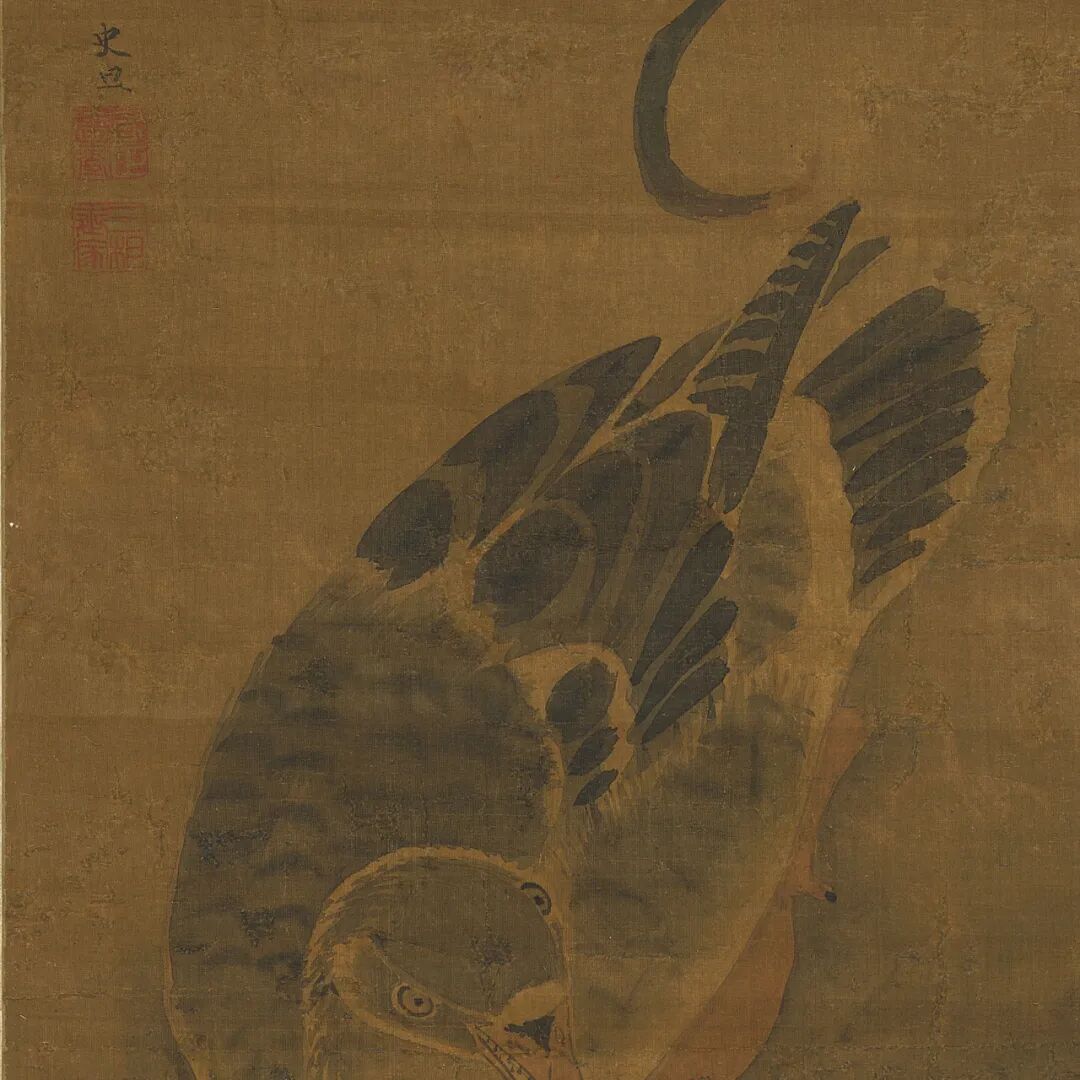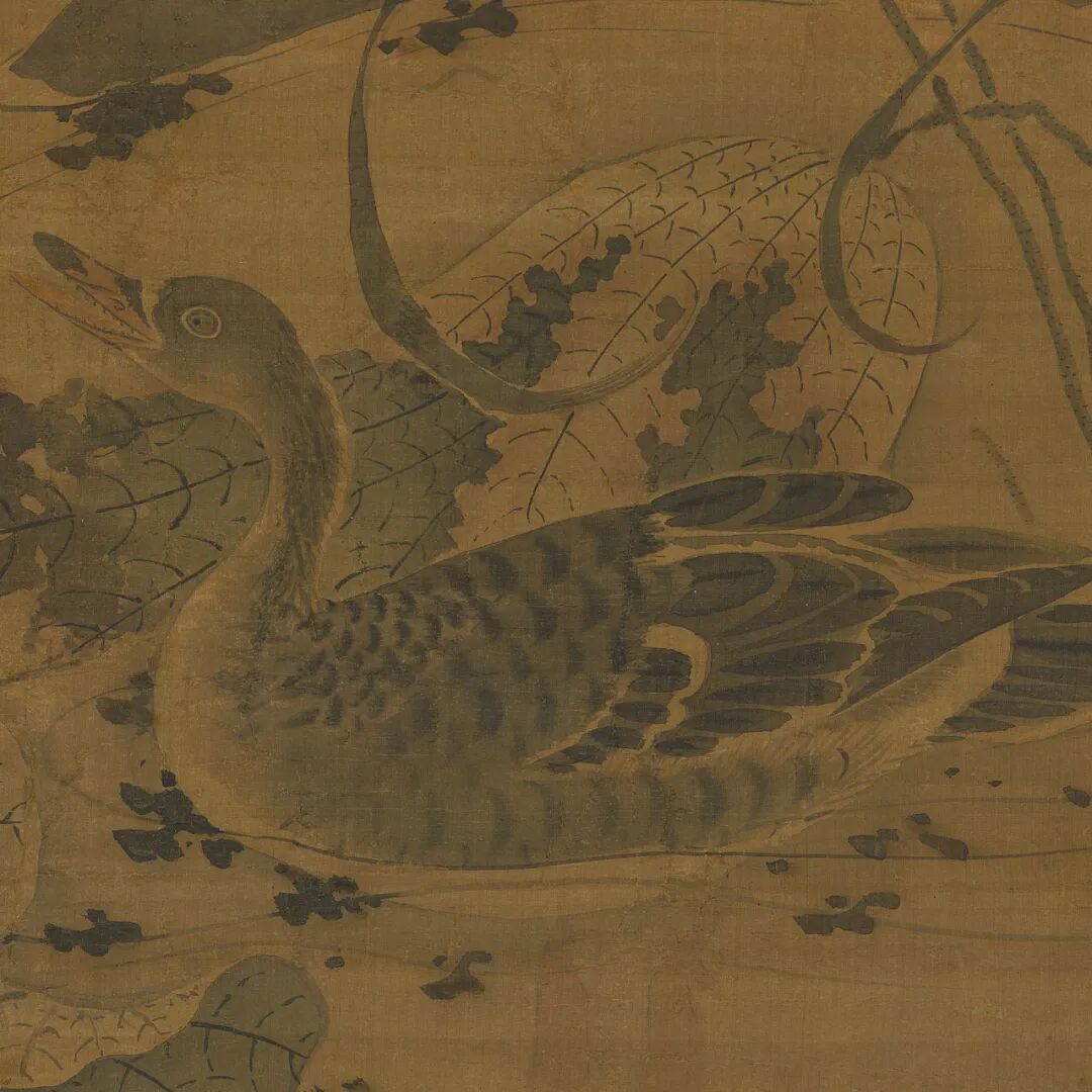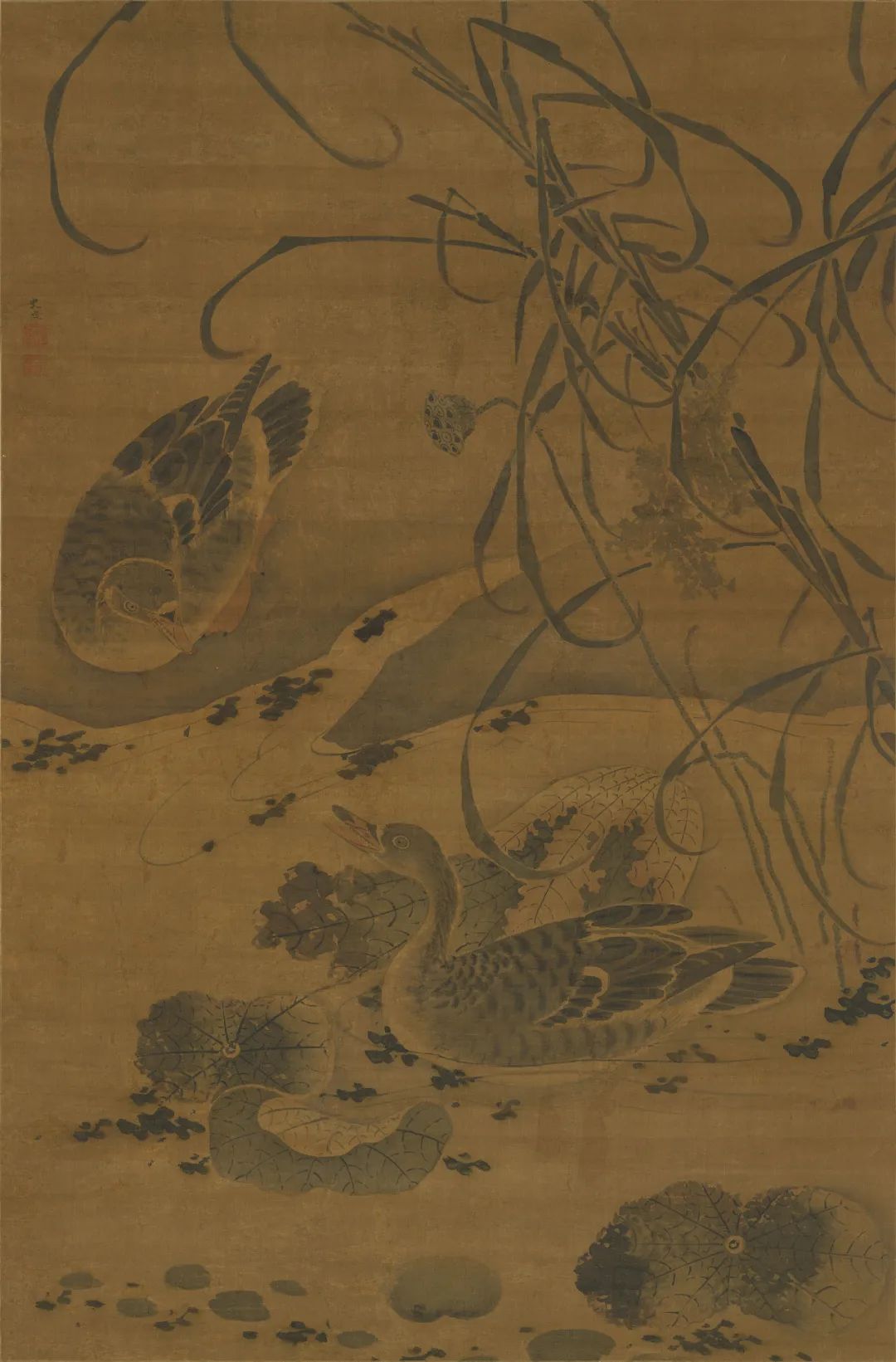 史旦作品具有一定的时代代表性,所绘均为当时流行的题材和风格,可为探讨当时花鸟画的发展提供参考。作者简介:史旦[明],浙江嵊县人。画禽鸟甚工,所作芦花群雁,洲渚萧瑟,落落有致。《明画录卷六》有载。史旦活跃于十六世纪,专以绘芦花群雁而享受誉于时,《画史会要》有云:“所为芦花群雁,率爱重之。”本作中所绘物象即属此类题材。芦雁有祥瑞之意,古人称“雁有四德,信礼节智”,《唐会要祥瑞》载“阳为君德,雁随阳者,臣归君之象也”。明朝朱元璋尤喜雁,曾著《雁归说》赞赏之,并将其与君子相比。故明代画家多以此为题材进行创作,不仅有平安祥瑞之寓,亦有一定的政治教化功能。画面中汀渚曲折,芦花摇曳,烟波出没,茂密的苇丛水墨写就,苇叶层层迭加,浓淡相间,层次感丰富而又不失之于琐碎。双雁游嬉栖卧,顾盼生姿,生动地刻画出荷塘野逸清幽的情趣,给人一种秋凉苍远的意境。其用笔粗简,洒脱爽劲,酣畅淋漓,富有较强的节奏感,应属“浙派”笔墨风格。