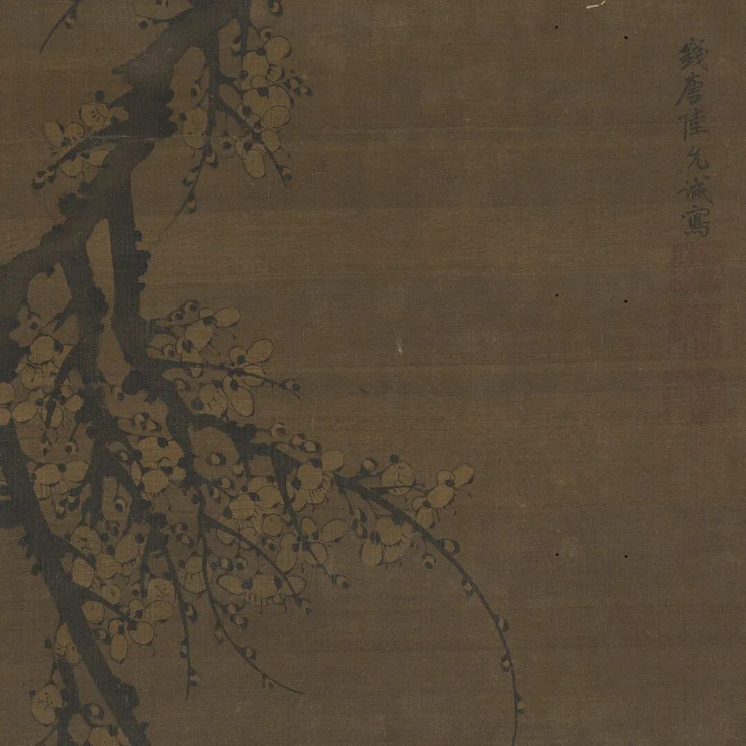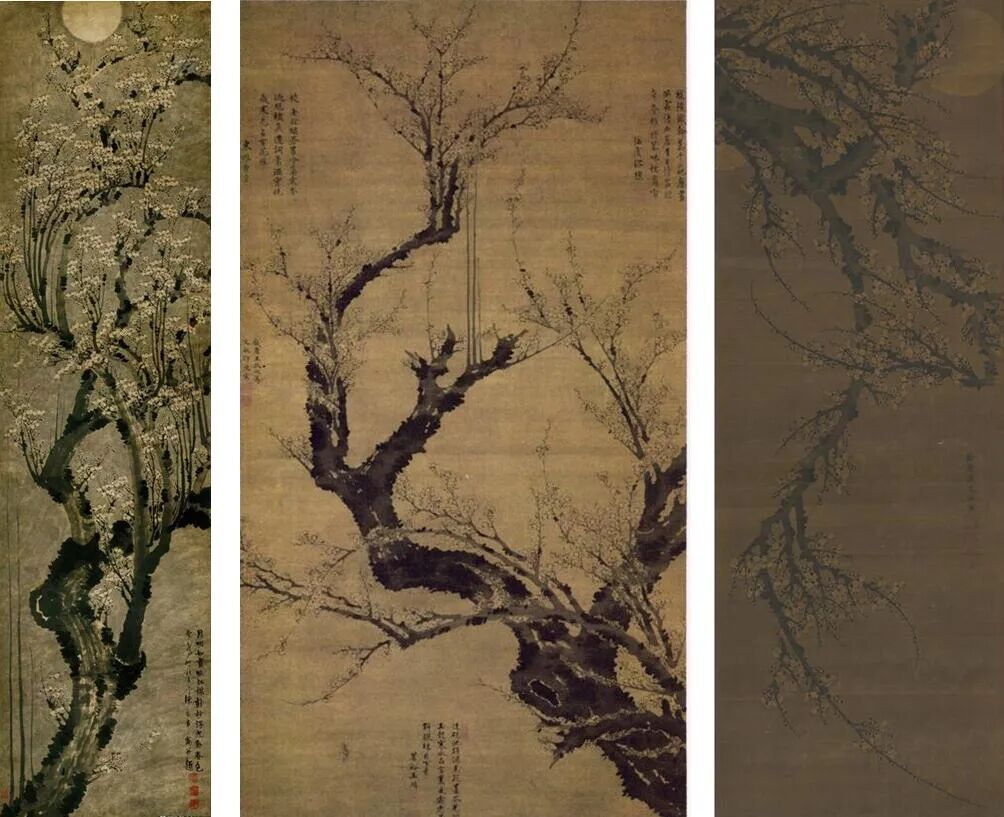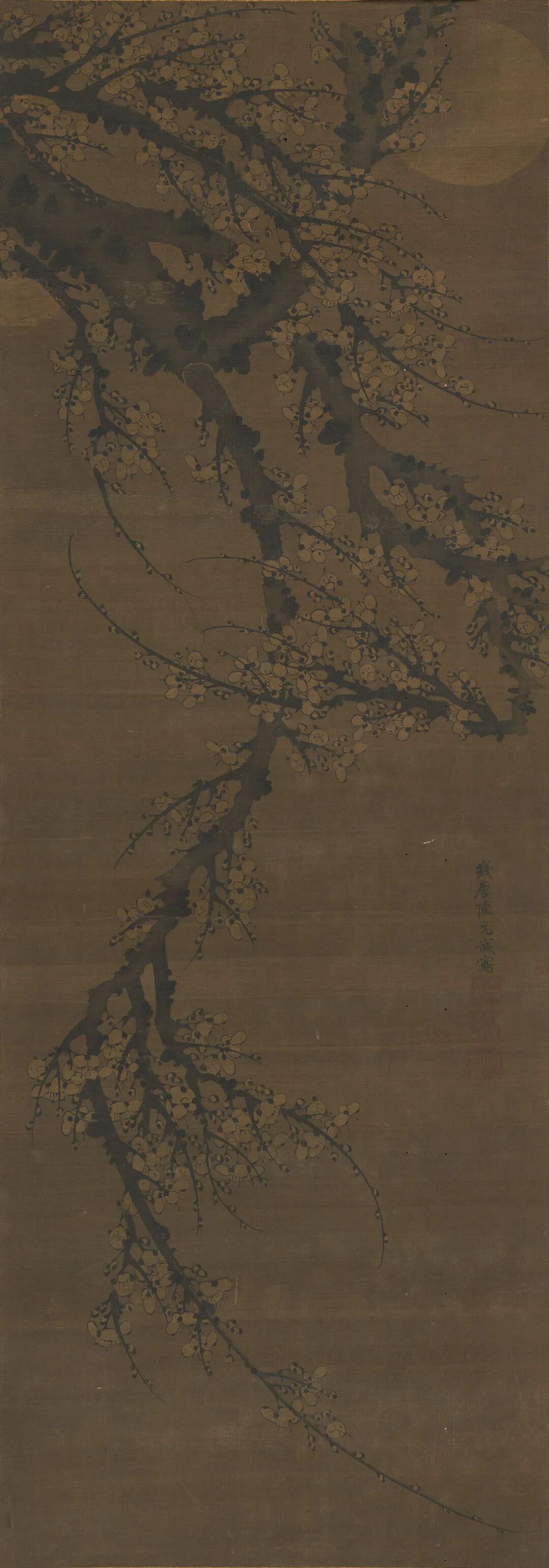 2.文政四年(1821)巳十月,伊川院法印荣信鉴定。陆允诚其人记载甚少,何许人也我们亦未可知,只可从画面中知其为钱塘人。视其梅花,绝类陈录、王谦(见下图)。王谦字牧之,号冰壶道人,浙江杭州人,大约生活于明朝永乐到正德年间。陈录字宪章,号如隐居士,浙江绍兴人。擅画松、竹、兰等,尤其墨梅是明代一绝,为时人所追捧。其墨梅构图多繁密,大气磅礴,观之有暗香逼人之感。![]()