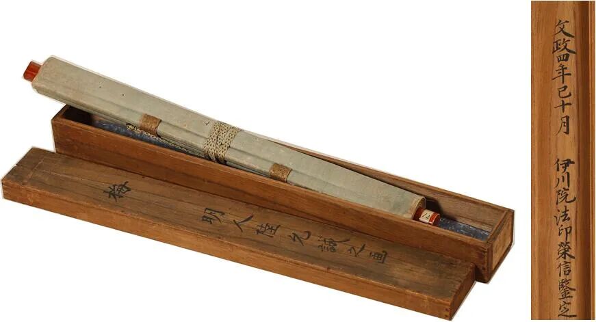 2.文政四年(1821)巳十月,伊川院法印荣信鉴定。说明:陆允诚为明代初期钱塘(今杭州)人,生卒年不详,善墨梅,接续元代王冕墨梅传统,呈现圆润温健,清劲可爱之态。墨梅意境与明初王谦、陈录等画梅大家不相上下。
