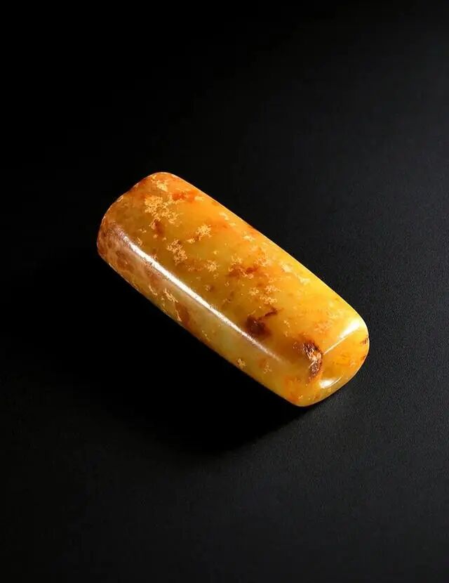 玉勒通体黄玉质地,玉质熟润而呈现栗子黄色,局部带有鲜艳红沁。勒子呈圆角的方柱状,外壁光素而带有自然开料打磨痕迹,风格遒劲而古朴,中打通孔以穿系佩戴。整体造型素雅大气,为古时贵族甚至一族、部落之长随身佩戴的装饰,实属收藏佩戴精品器物。