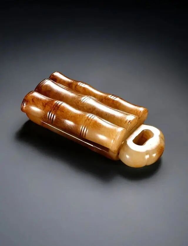 此枚带穿白玉质地,玉质细腻温润,器物满带鲜艳红沁,如白云染红霞。整体作扁体长方形,主面以浮雕技法雕琢作三束竹节造型,一侧出如意云头状的环舌用以勾挂其他物品。整体造型古朴典雅、精致美观,器型少见,料沁俱佳,寓意君子如竹、坚韧不拔,适合作为收藏佩戴装饰。