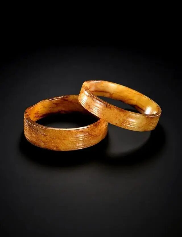 此对手镯以黄玉雕琢而成,玉质细腻晶莹而色泽栗黄,光气温润;通体微带有红沁灰皮。镯形为筒状,二者应本为一件圆筒形琮或箍,以中部对切开料,一分为二形成的手镯;镯壁微薄,外壁满以打洼制作瓦楞弦纹装饰,两只手镯纹饰对接自然。此器原本所作的箍形器费时费工雕刻难度极大,非一般人物所能拥有,该器物虽为装饰类用玉,但其用途极为特殊,是高等级贵族出席重大祭祀礼仪时专门的佩冠用品,其珍贵程度可见一斑,其后改制为对切的玉镯,更显得玉料之珍贵。而手镯,亦称“钏”、“手环”、“臂环”等,是一种戴在手腕部位的环形装饰,其由来已久,起源于母系社会向父系社会过渡时期。据有关文献记载,在古代不论男女都戴手镯,女性作为已婚的象征,男性则作为身份或工作性质的象征。此外,在古代社会,人们还认为戴手镯可以避邪或碰上好运气。此对镯整体造型精致大气,器型古朴宽厚、独特少见,十分适合作为收藏佩戴。