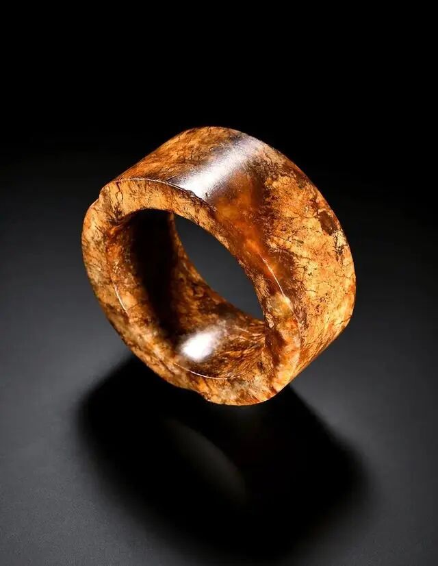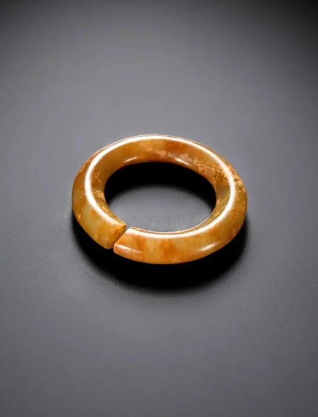 此枚手镯以黄玉种雕琢,质地细腻温润而通体带有鲜艳红沁,沁色美艳动人,光气颇为熟润。整料雕琢一枚圆筒手镯样式;雕琢工艺粗犷而镯肉宽厚,侧边还可见有自然切磨开料所残余的痕迹。应为古时部落巫祝贵族佩戴礼仪之物。整体造型简洁美观,古朴大气,沁色美丽非常,适合作为收藏佩戴把玩之物。