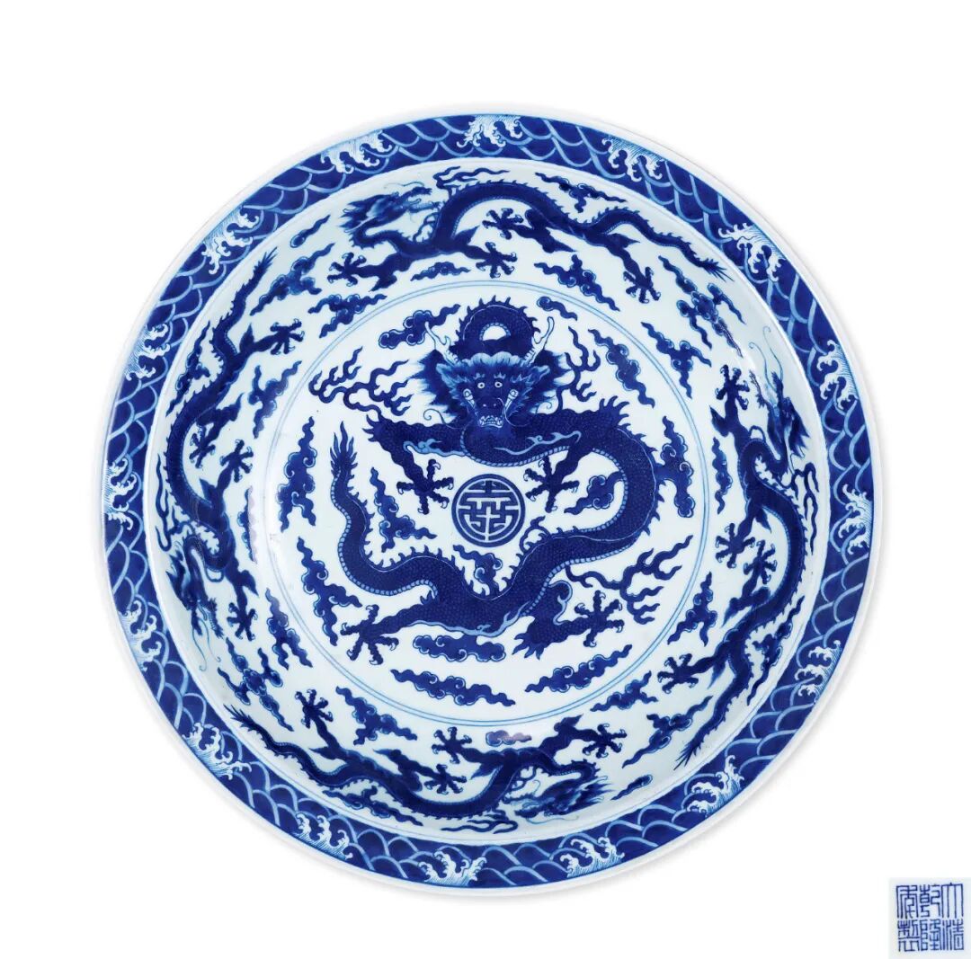 清乾隆 青花海水雲龍紋折沿大盤