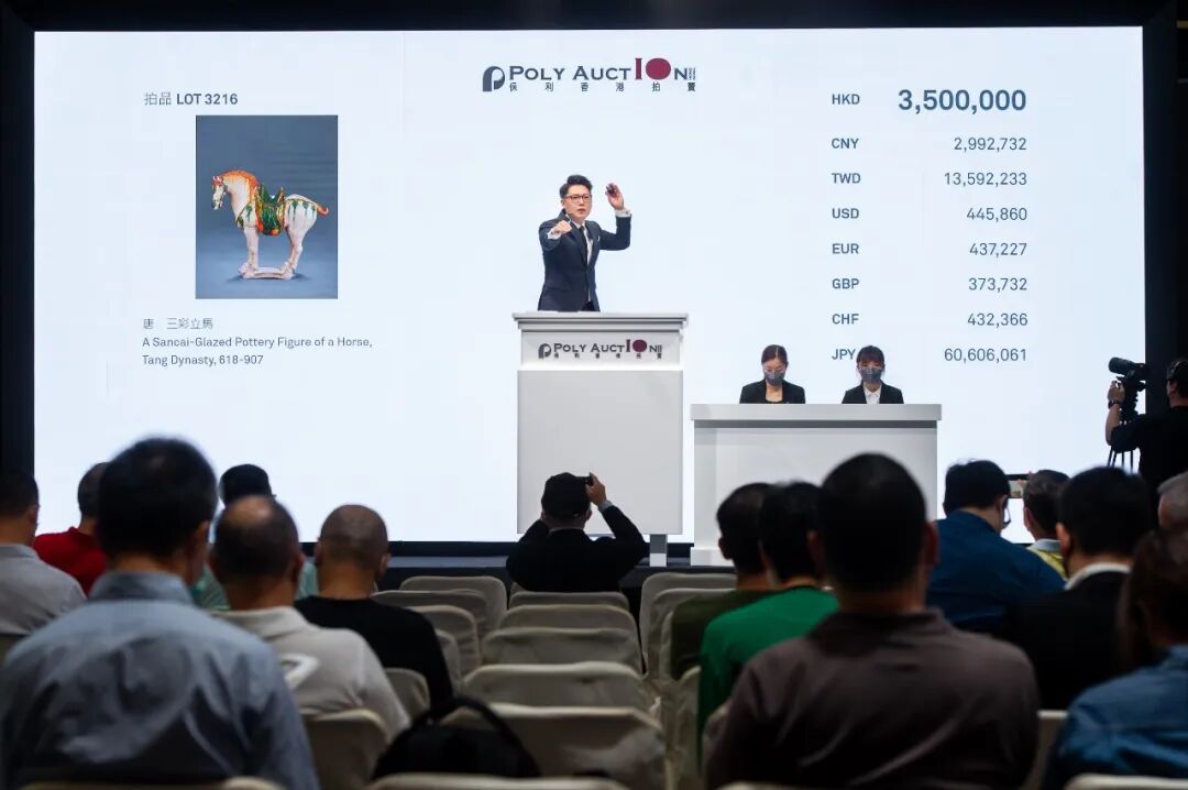 「花舞大唐:北美十面靈璧山居珍藏唐三彩」專場總成交額達港幣5,000萬元,總成交率88%,逾60%的拍品以超高估價成交!其中唐 三彩罐經過場內、線上及電話委託多番激烈競投,以低估價24倍的價格,港幣720萬元成交,為歷年最高價唐三彩拍品!封面作品唐 三彩立馬和唐 褐地綠彩碎花瓔珞三彩馬分別以港幣420萬元及360萬元成交!