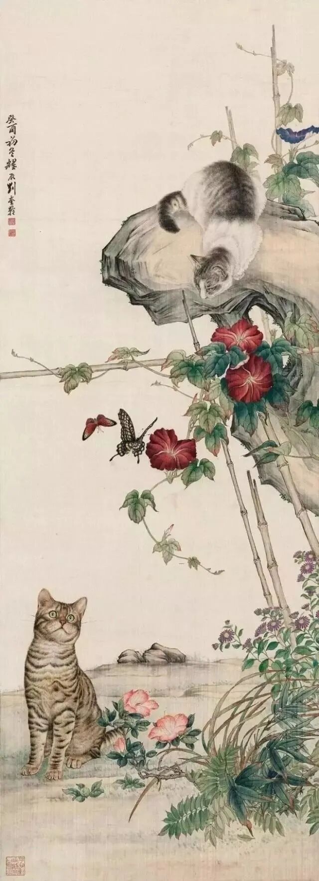 刘奎龄画猫,采用了西方水彩画的“湿画法”与传统中国画的“没骨点染”,惟妙惟肖地表现出小猫的形体结构、皮毛光泽。