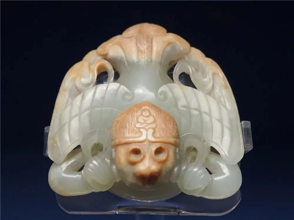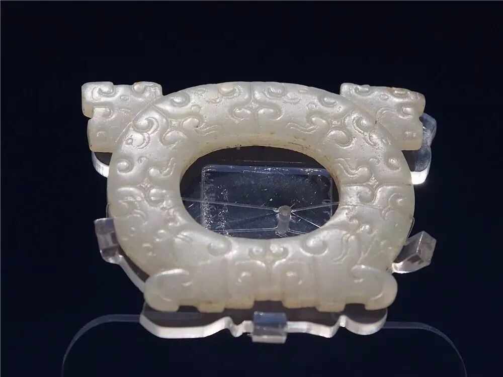 玉出土,有形如瓷片者,有形如瓦片者,有形如石灰者,有形如枯骨者,有形如兽角兽牙者,有色如木炭者,有色如生姜者,有色如烂酱者,有色如鲜枣者,有半露质地者,有不露质地者,有带玻璃光者,有遍体不露玻璃光着,此种形形色色,愈古愈怪,真令人难测。嗜古者,当格外小心,切不可 因其形色而忽之。诚以斑锈深厚,年愈久而形色愈黯,一经盘出,各种色沁,毕露其精采,有匪夷所思之妙。露质地者,固佳,不露质地者,其古香异采,尤其奇绝,此不可为知者也。