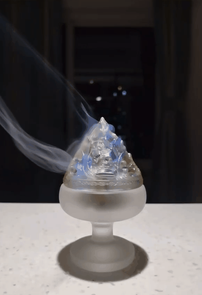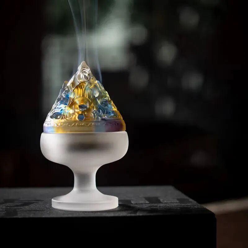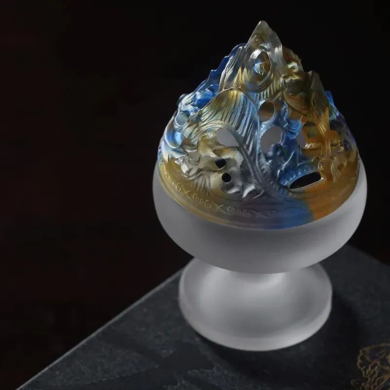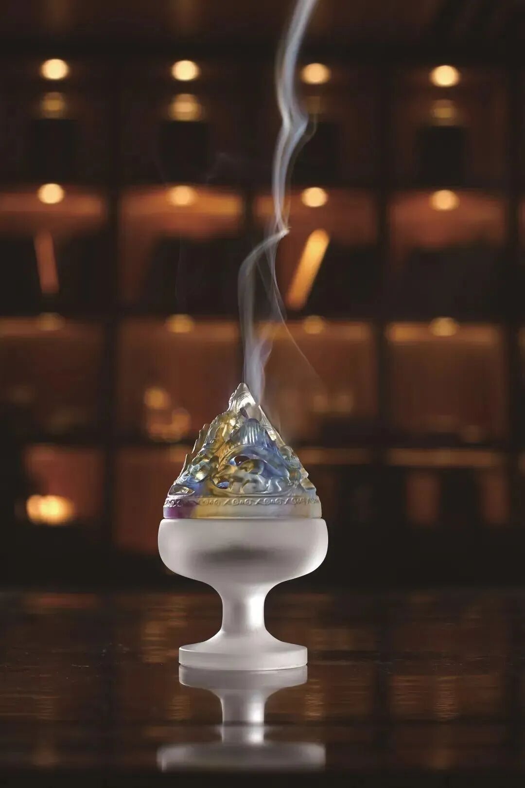 凌鲲直言:“一昧地重复古人创作的博山炉没意思,如今中国人有更适合自己的生活美学”。一方面,他与研究团队查阅大量古籍资料,参考大量汉代博山炉原型,并结合现代人审美,为其重塑炉身;另一方面,他舍弃了常见的铜、陶,选择了更轻盈通透的琉璃。琉璃清透明澈、瑰丽多彩,净无瑕秽,与缥缈通透的沉香交融而生、相得益彰,让古器显得更加轻盈别致。