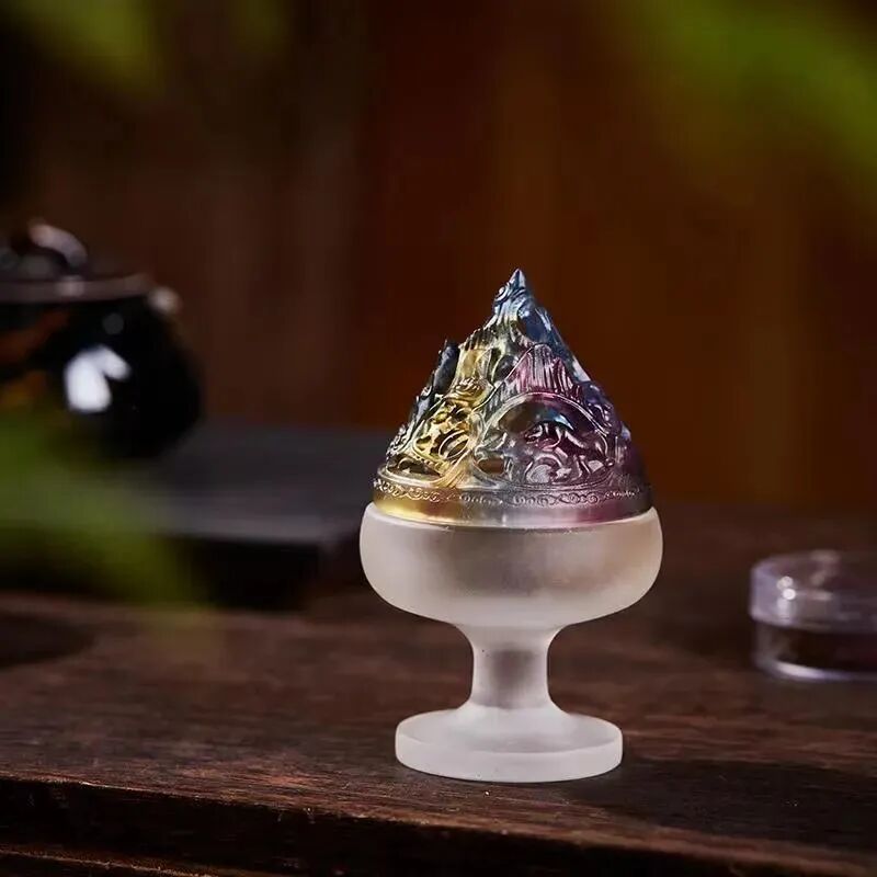 彩色琉璃博山炉复刻自九龙沉香博物馆馆藏汉代青铜博山炉盖。凌鲲和团队将旧时皇家日用之物,化作新中式生活的雅器,同时颠覆了传统上金属质地的博山炉形象,取博山之形,铸琉璃之身,融五行五色。