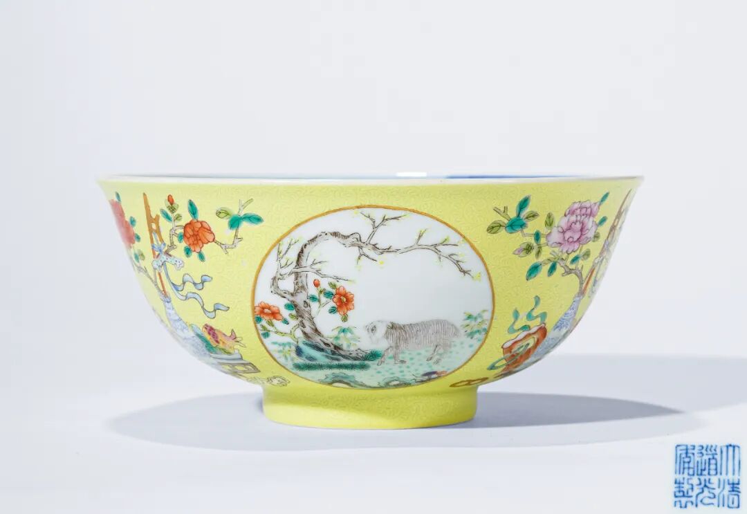 此碗式样为清代传统官窑,自乾隆二年时已开始烧制,在清宫内务府造办处档案称「洋彩黄地洋花宫碗」,《江西烧造瓷器处》乾隆二年十月十三日记载:「司库刘山久、七品首领萨木哈,催总白世秀来说太监胡世杰、高玉交……洋彩黄地洋花宫碗一件。传旨:……洋彩黄地洋花宫碗甚好,再烧造些……钦此」。由此可见乾隆皇帝对此式碗甚为钟爱,此后至道光,历朝均有烧造,极其华美瑰丽,具有浓郁的宫廷风格,十分精彩。