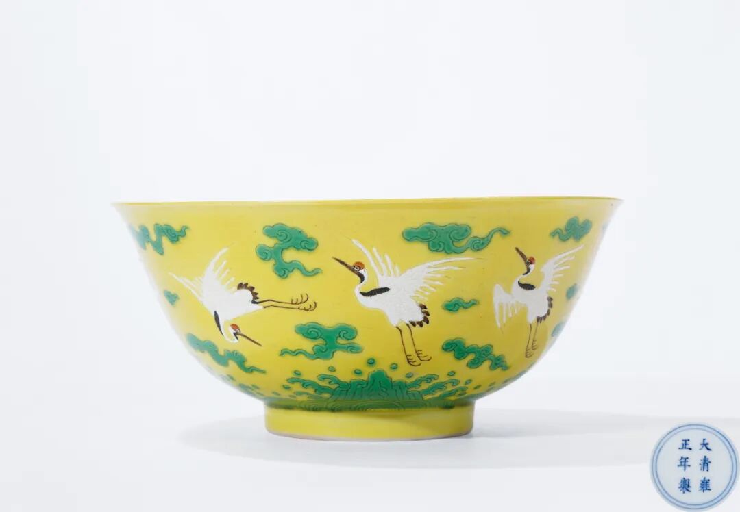 Lot 0648 清雍正黄地粉彩云鹤纹碗