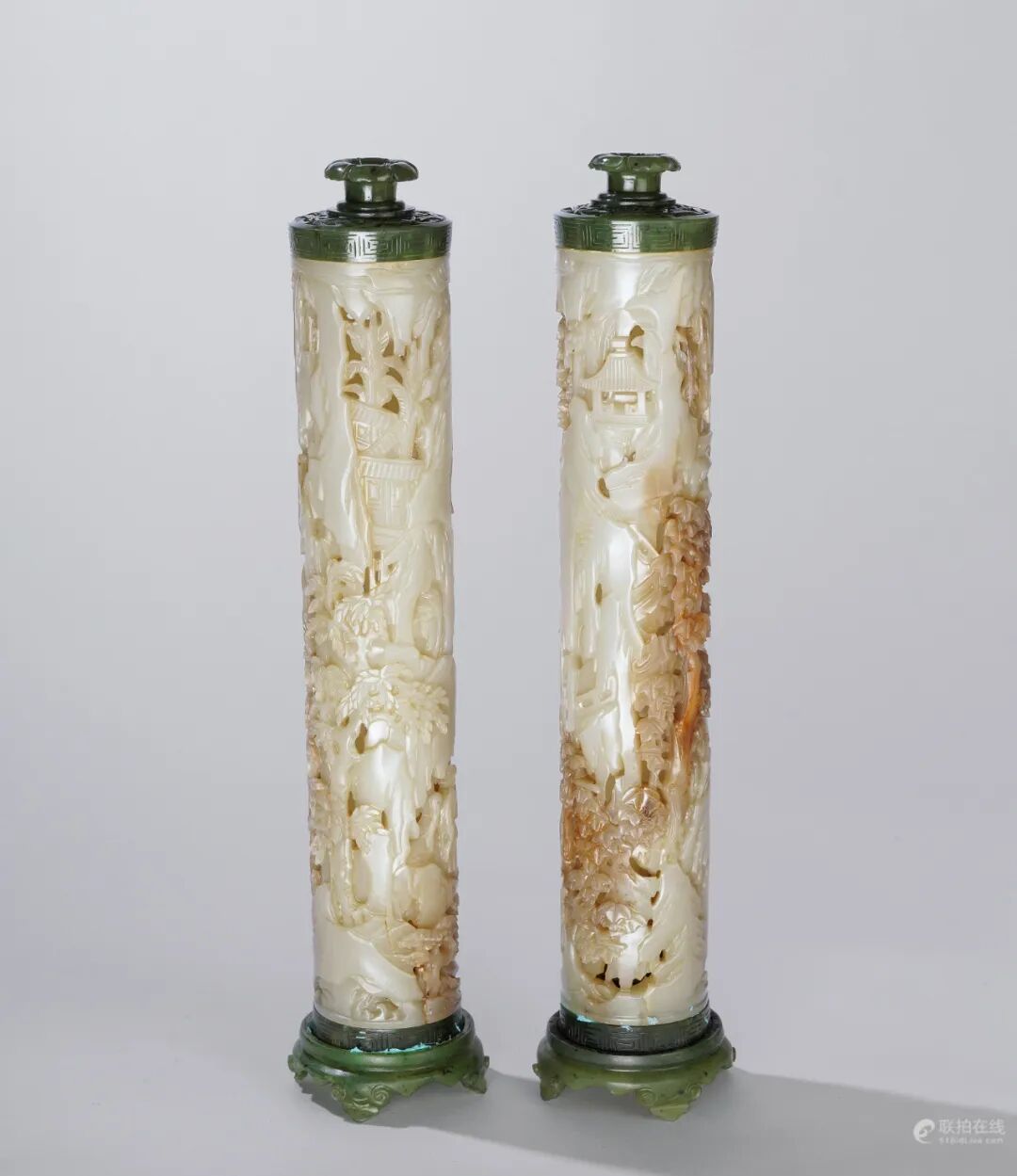 Lot 1895 清乾隆 玉雕山水人物香筒 (一对)