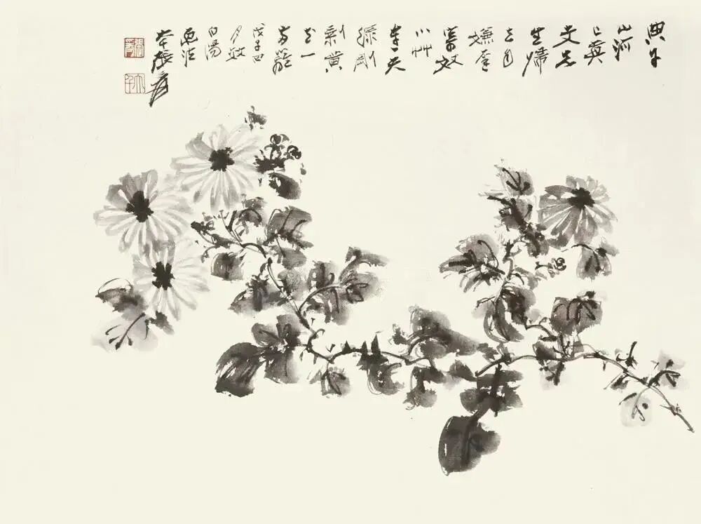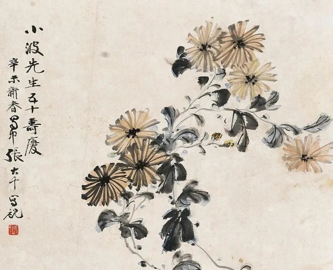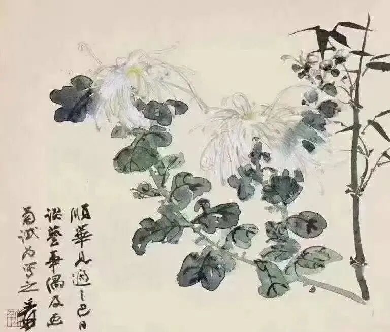 这幅《竹菊图》正是拜登身后墙上的画:画面画了一株菊花,两朵白色花头娇艳欲滴。菊花旁边,画了一竿竹子,形成三角形构图,既活泼又稳定,堪称佳构。作为全能画家,张大千人物山水花鸟无一不精通,大家都知道大千爱荷花,大千不仅荷花画的好,其他花卉也很精通。![]()